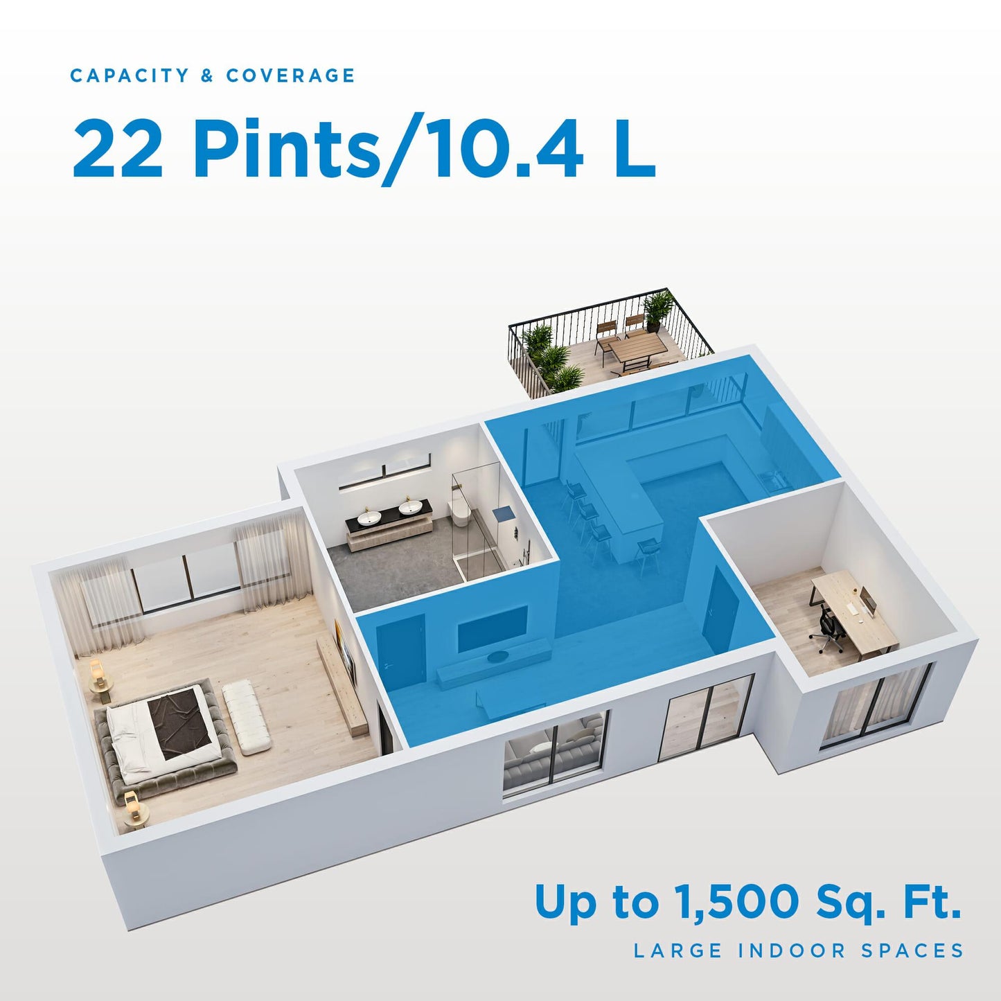 - 22-pint (10.4 L) Dehumidifier:controls humidity in spaces up to1,500 sq. ft.