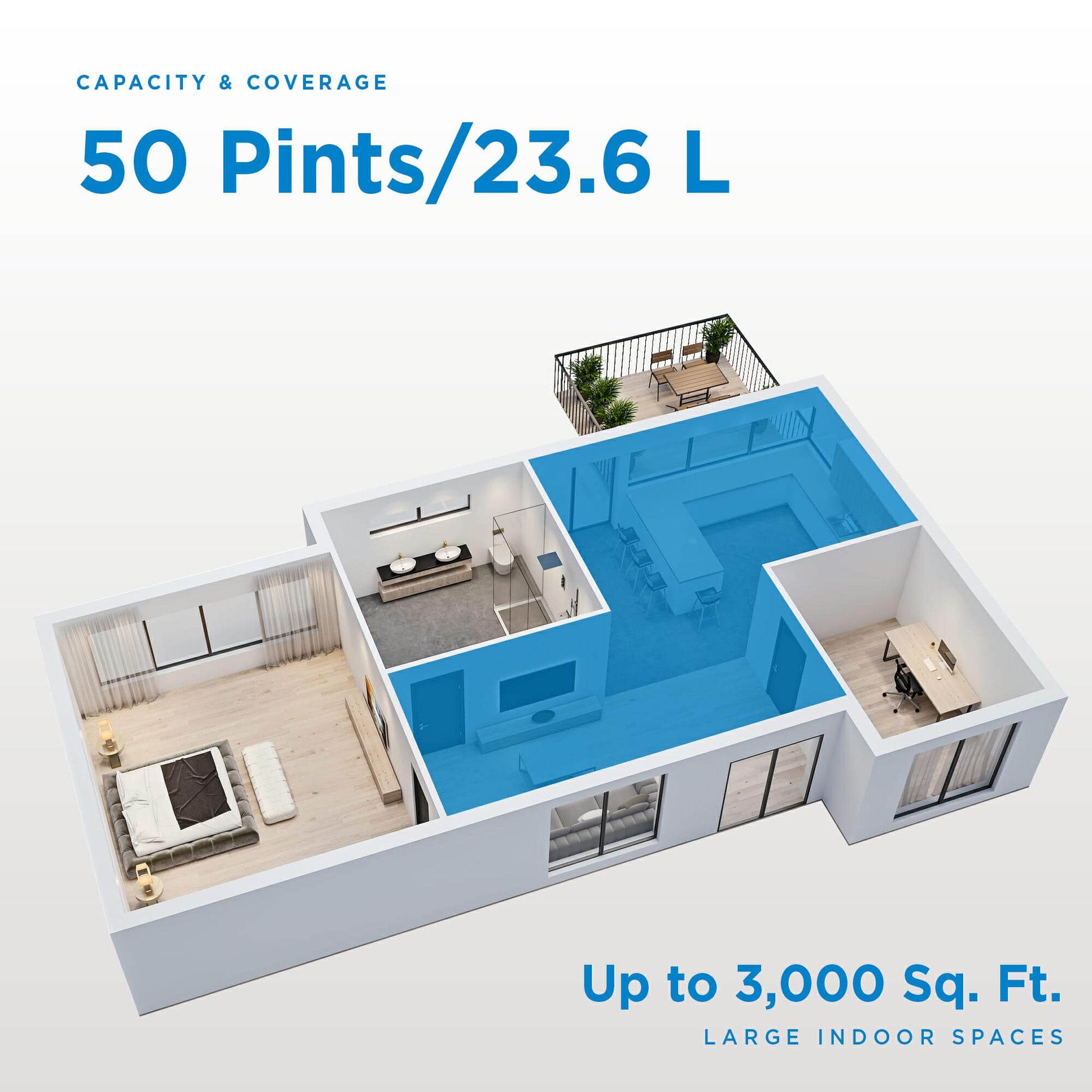 - 50 Pint (23.6 L) Dehumidifier: Controls humidity in spaces up to 3,000 sq. ft.