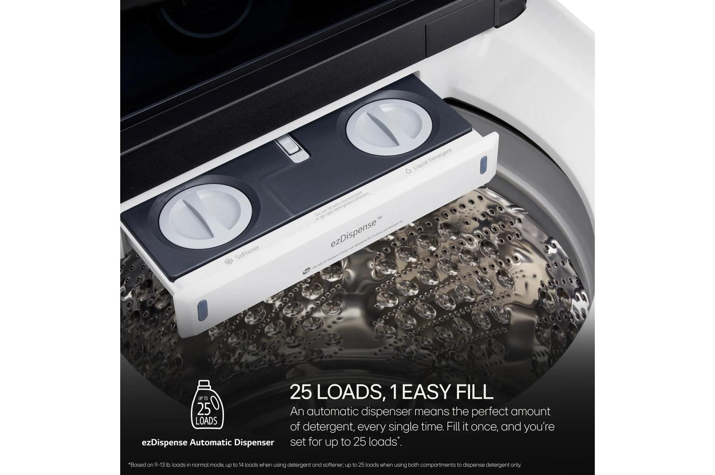 With ezDispense® Automatic Dispenser, just fill the reservoirs once and you're set for up to 14 to 25 wash cycles 4 with versatility of using detergent and softener or detergent only. Not only is it quick and easy, but it helps make laundry foolproof, adding just the right amount for each load size-at just the right time. You can even get an alert on your smartphone when it's time to refill, so you never miss a beat! 5
