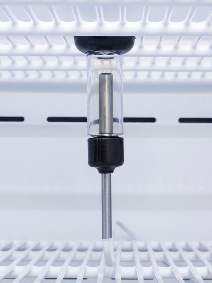 - Thermometer probe is encased in a glass bead-filled bottle to better simulate temperature readings closest to stored contents