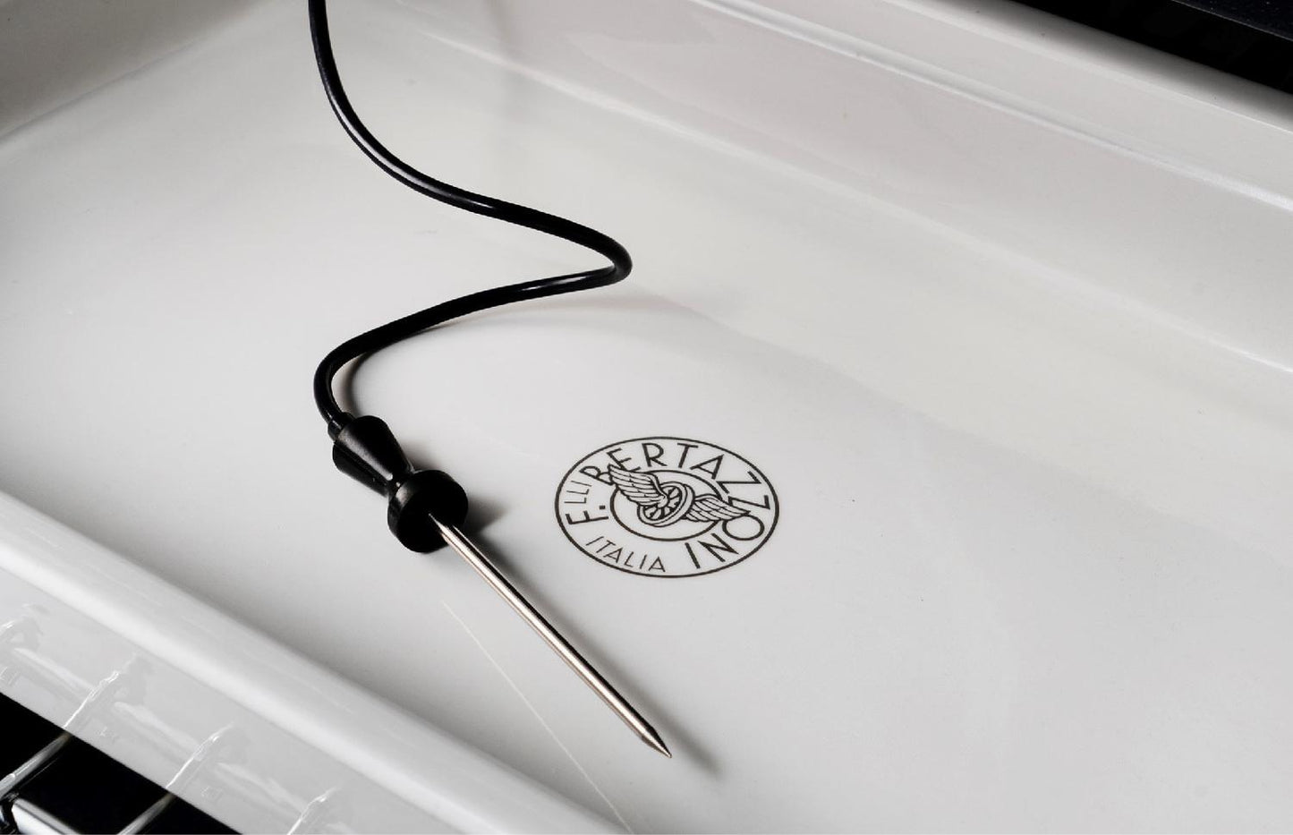 The 5.9 cubic feet oven cavity is the largest in its class, with dual convection fan for balanced airflow and even temperature baking and roasting on 7 shelf levels. The elegant digital gauge gives precise control of oven temperature during pre-heating, roasting and baking, and has integrated controls for the food temperature probe. The extra wide infrared gas broiler is ideal for grilling and searing at high heat. The oven includes convenient features such as smooth telescopic glides for the oven shelves and soft-close doors. The edge-to-edge interior oven glass door maximizes interior volume and can be wiped clean without effort.