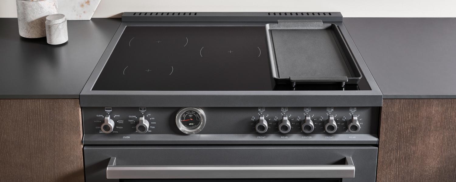 This all-new induction range has 5 high-power heating zones with maximum power output of 3700W. The right-side heating zones can be bridged to create a larger cooking area. Each induction area is controlled with knobs and has a convenient read-out interface on the glass worktop. A large, removable cast-iron griddle is included.