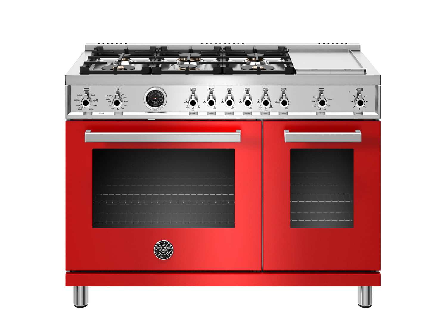 Bertazzoni PROF486GDFSROT 48 Inch Dual Fuel Range, 6 Brass Burners And Griddle , Electric Self Clean Oven Rosso
