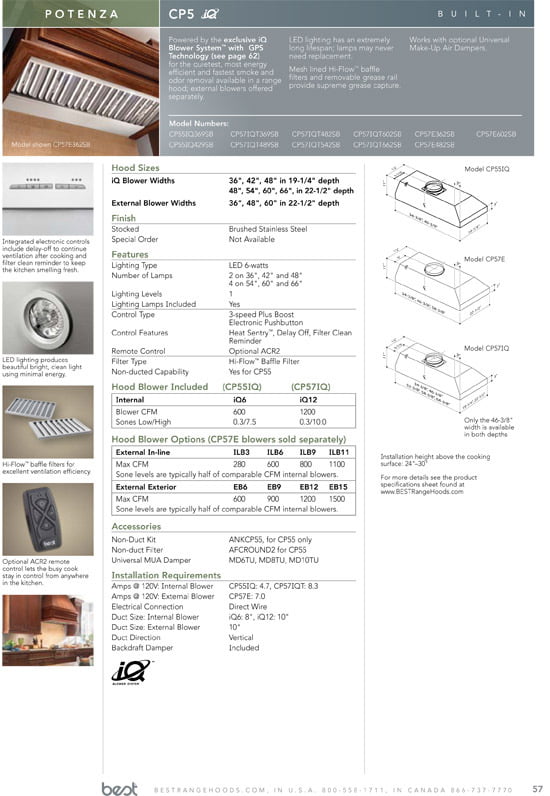 Potenza Pronunciation: "Poh-Ten-Zah" Features Powered By The Exclusive Iq Blower System™ With Gps Technology For The Quietest, Most Energy Efficient And Fastest Smoke & Odor Removal Available In A Range Hood. The Cp5 Series Are The First Built-In Hoods To Feature The Bright, Clean And Energy Efficient Lighting Of Led Lamps. The Cp5 Family Of Hoods Offers A Broad Selection Of Widths In A Choice Of Two Depths So You Can Choose The Right Size To Suit Your Kitchen And Cooking Style. (Ul)(Li)Quiet 1200 Cfm Iq12 Blower System With High Efficiency Bldc Motor Provides Up To 30% Faster Smoke And Odor Removal Than Comparable Models(/Li)(Li)Flush Built-In Design Has An Integral Liner To Protect Cabinets, Make Installation Easy, And Allow You Flexibility To Achieve Your Kitchen Design Dreams(/Li)(Li)Two Led Lamps, Designed For Durability And Extra Long Life - You May Never Replace A Lamp Again(/Li)(Li)3-Speed Electronic Controls Plus Boost Have An Led Display Allowing You To Choose Just The Right Speed To Handle What'S Cooking(/Li)(Li)Distinctive, Hybrid Aluminum Mesh & Stainless Steel Hi-Flow™ Baffle Filters Effectively Capture Grease And Are Dishwasher Safe Making It Easier To Have A Cleaner, Odor-Free Kitchen. An Electronic Filter Clean Reminder Will Help To Ensure Filters Are Cleaned Regularly To Maintain Peak Performance(/Li)(Li)Heat Sentry™ Detects Excessive Heat And Adjusts Blower Speed To High Automatically To Prolong Product Life By Reducing Damaging Effects Of High Temperatures(/Li)(Li)10 Minute Delay-Off Feature Keeps Hood Running After Cooking To Ensure Smoke & Odors Have Cleared The Environment(/Li)(Li)Can Be Used With Optional Universal Make-Up Air Damper Md6Tu, Md8Tu Or Md10Tu To Replace Air Exhausted Out Of The House Only When The Hood Is Turned On, Helping With Ventilation To Keep Your Home Fresh While Reducing Energy Consumption(/Li)(Li)Optional Acr3 Remote Control Allows The Busy Cook To Stay In Control From Anywhere In The Kitchen(/Li)(/Ul)