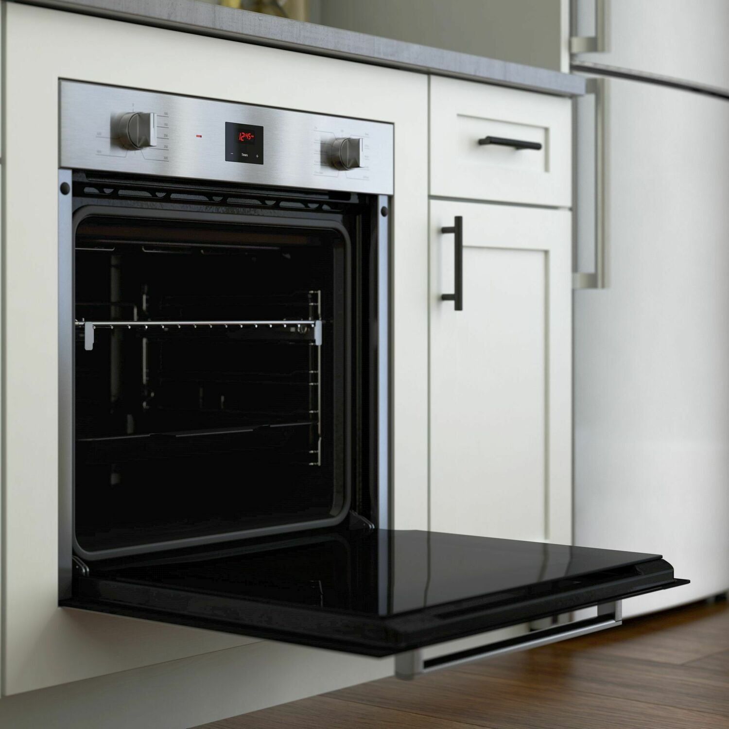 - A full-extension telescopic rack provides a smooth glide and better access to the oven cavity.