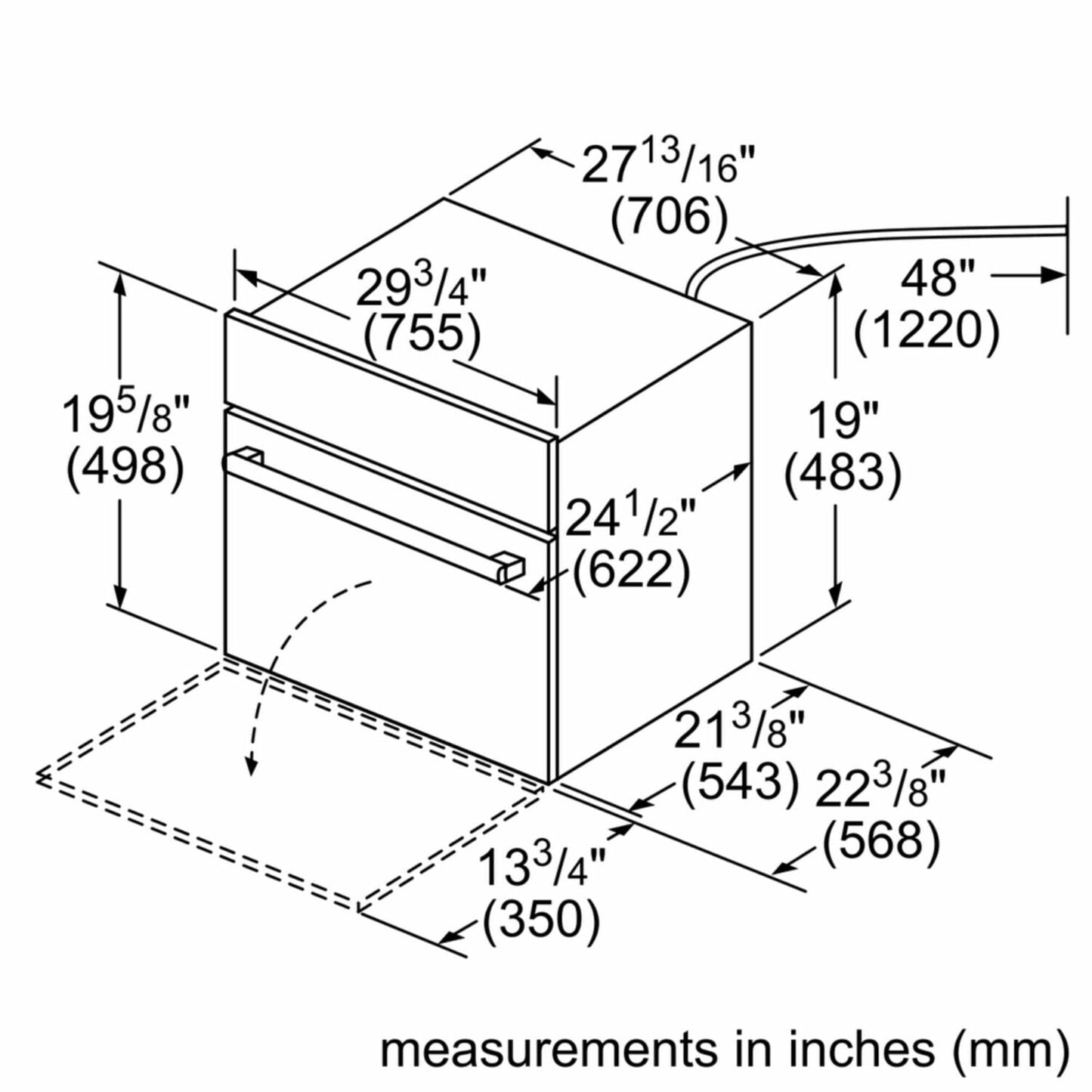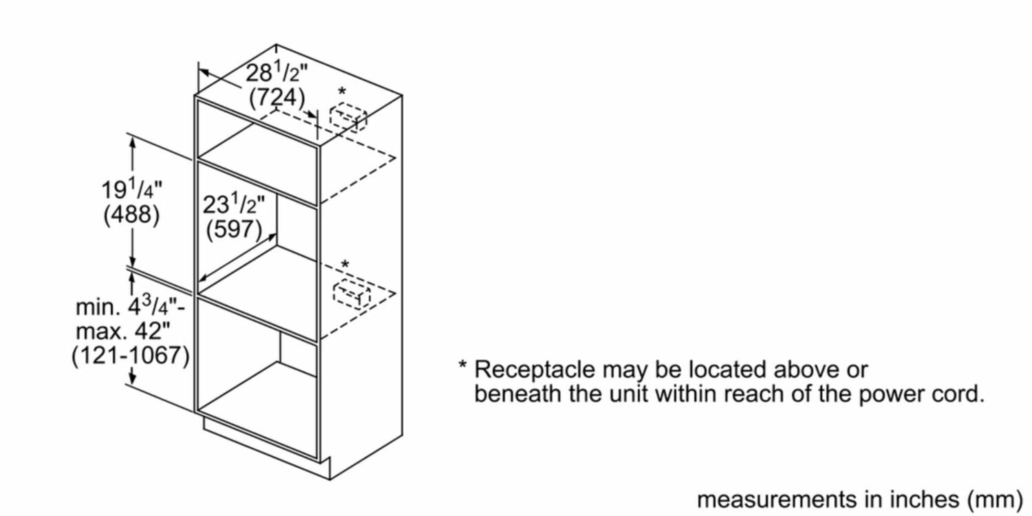 | Required cutout size (HxWxD) (in) | 19 3/16'' x 28 1/2'' x 23 1/2'' |