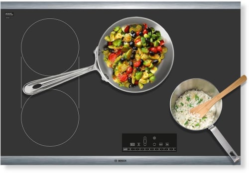 This 30-inch Bosch electric cooktop features touch controls, a two-level heat indicator, countdown timer, SpeedBoost, PreciseSelect with 17 settings, and a bridge element.