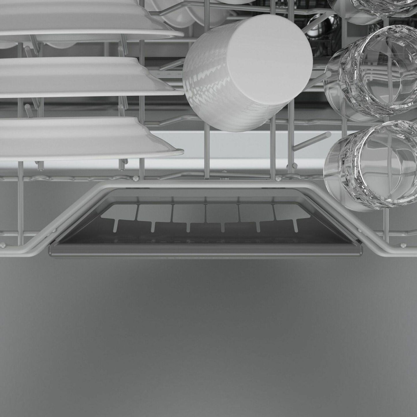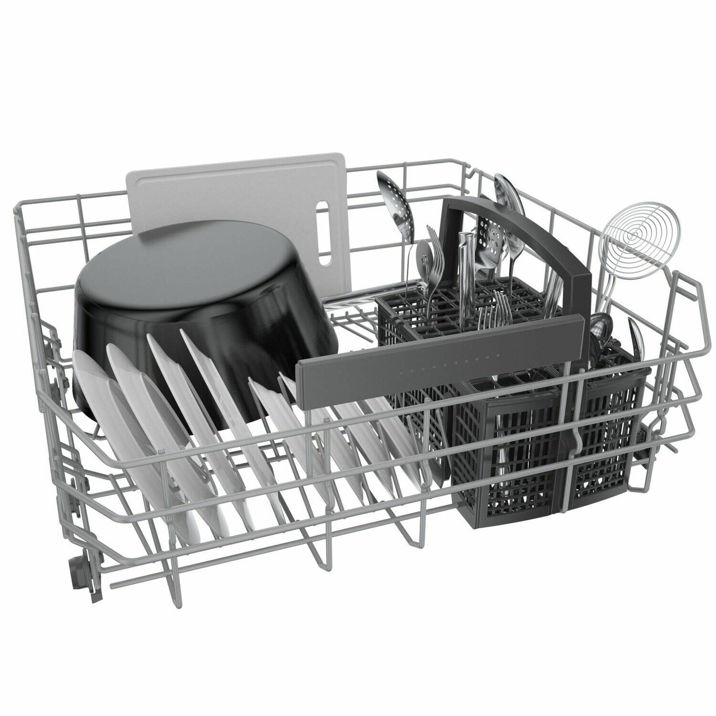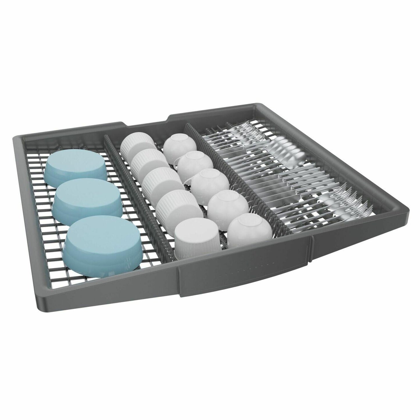 With 30% more loading area (compared to a Bosch dishwasher with 2 racks) the 3rd rack provides extra space for flatware, large utensils and measuring cups. Its V shape leaves room below for tall items.