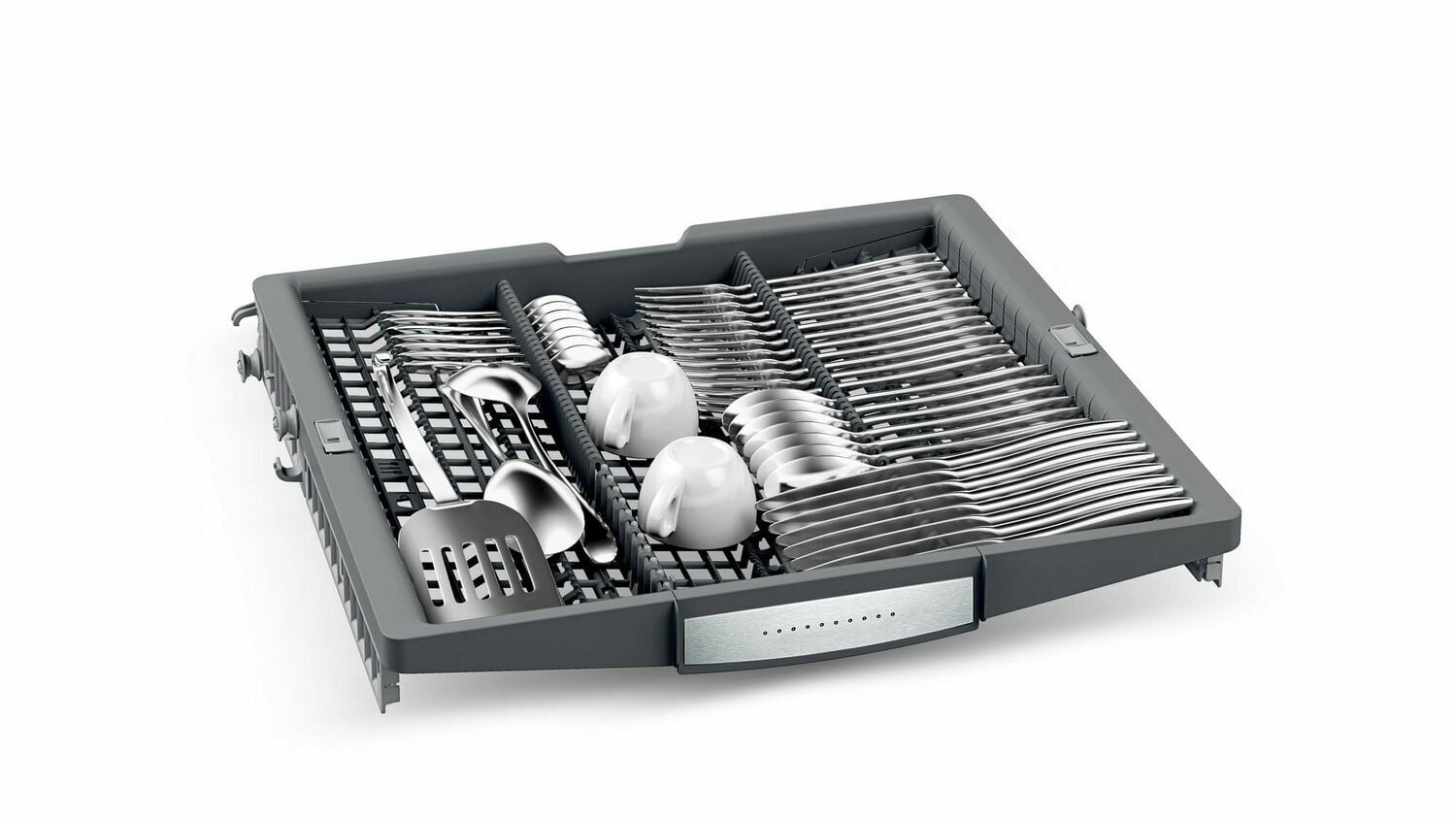 With 30% more loading area (compared to a Bosch dishwasher with 2 racks) the 3rd rack provides extra space for flatware, large utensils and measuring cups. Its V shape leaves room below for tall items.
