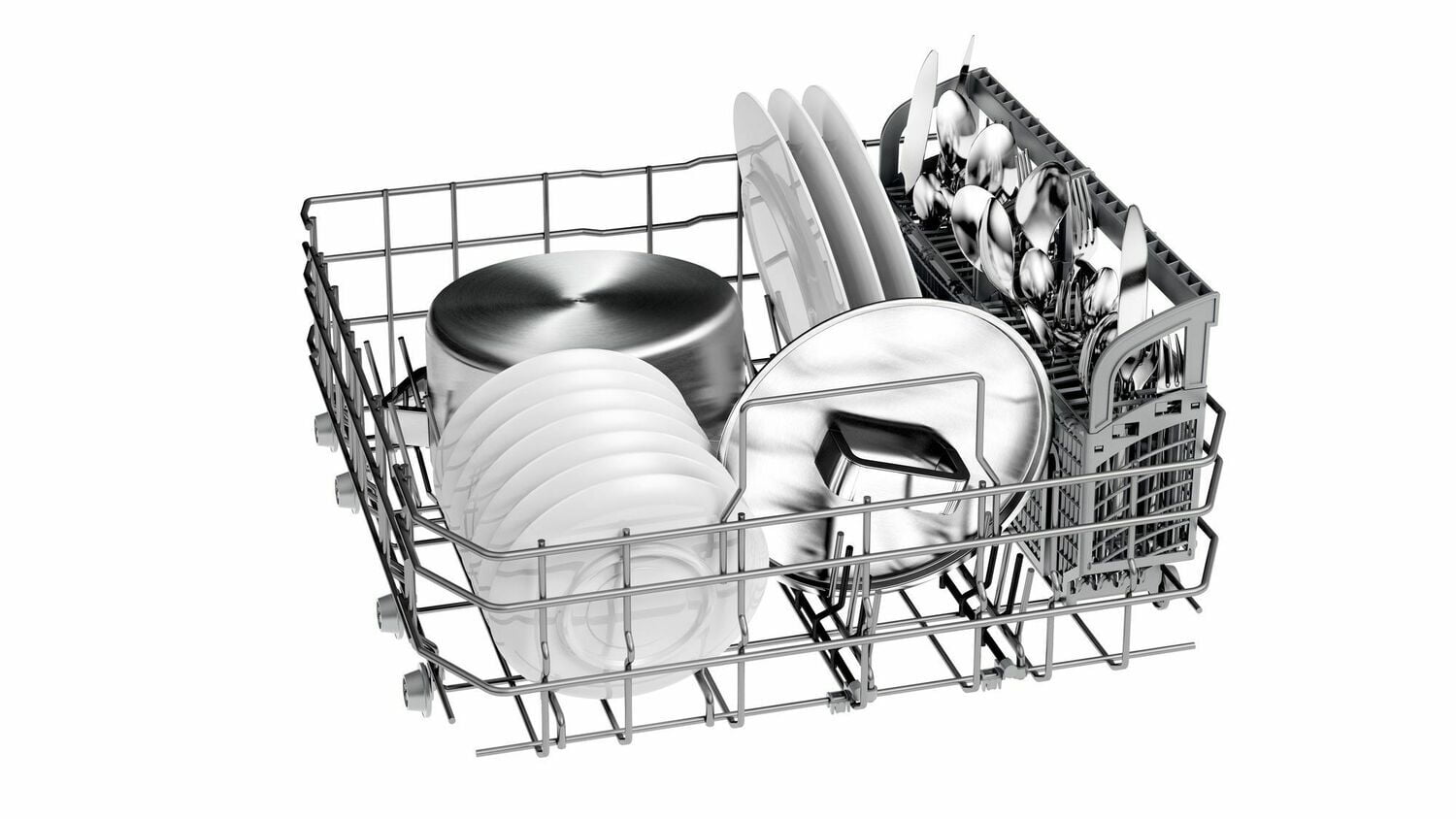 With 30% more loading area (compared to a Bosch dishwasher with 2 racks) the 3rd rack provides extra space for flatware, large utensils and measuring cups. Its V shape leaves room below for tall items.