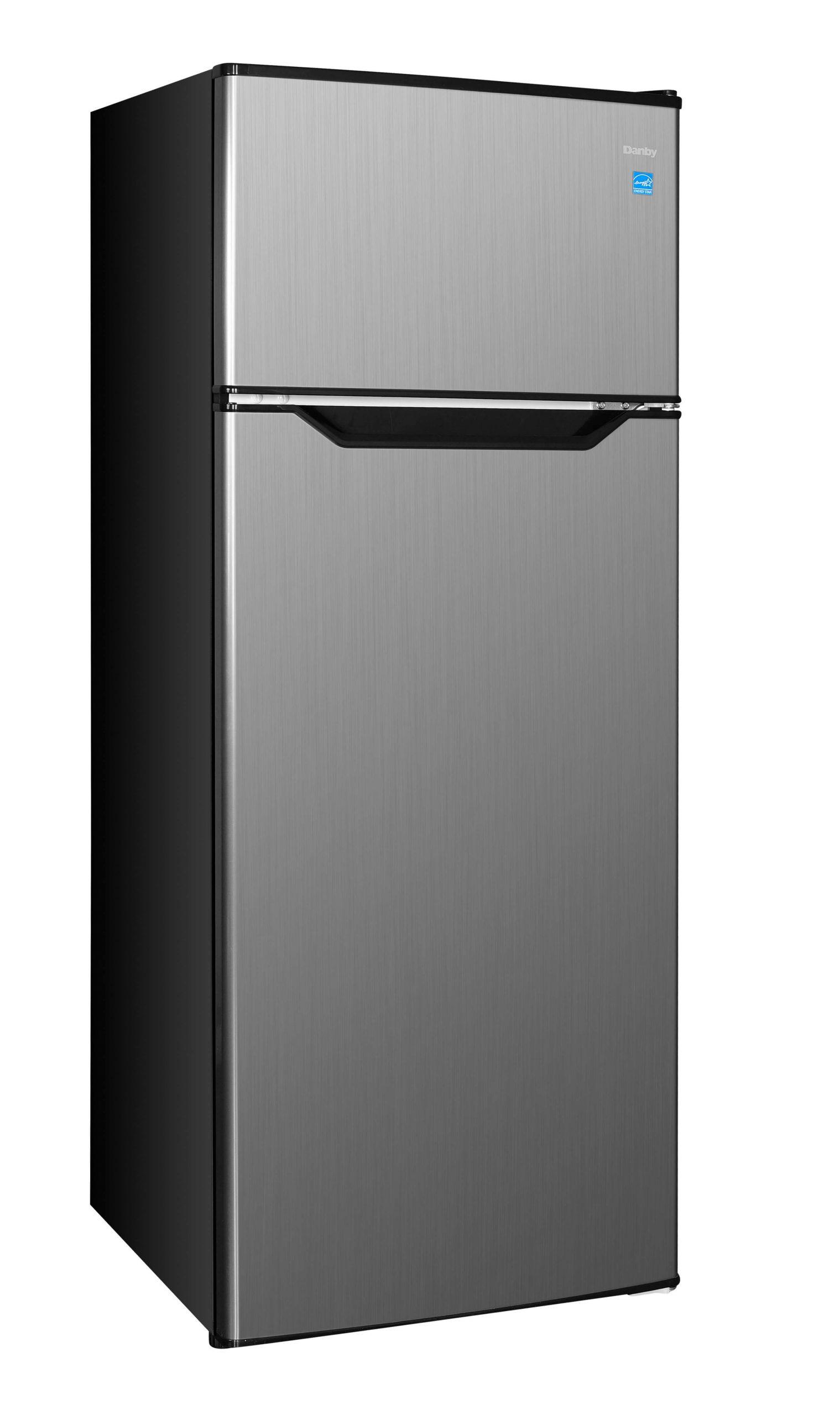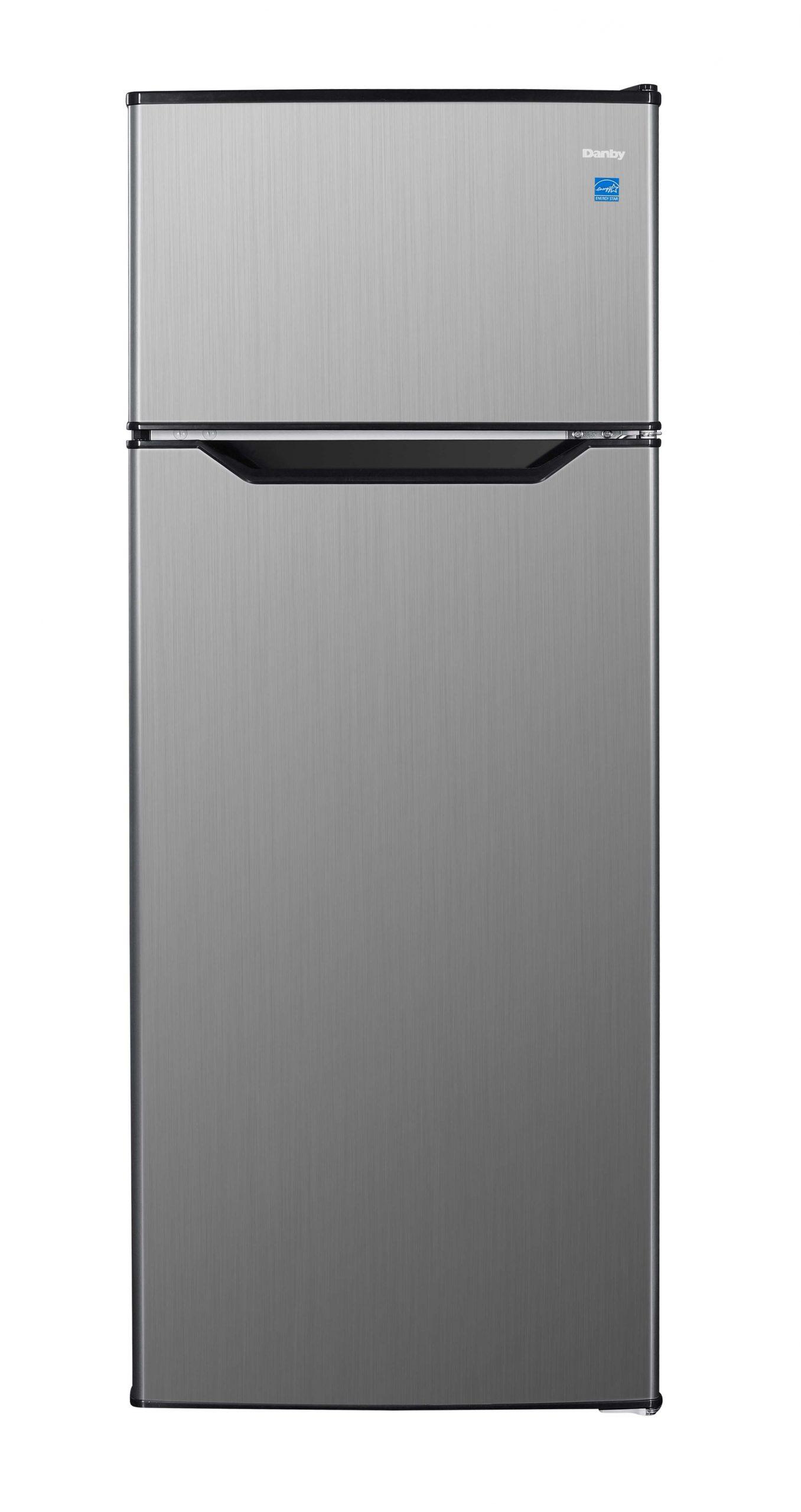 Discover The Styling And Simplicity Of Danby'S 7.4 Cubic Feet (210 L) Stainless-Steel Top-Mount Refrigerator, Perfect For Small Space Living In A Condo, Apartment, Or Townhouse! Reduce Your Electricity Bill And Save On Energy With This Energy Star Rated Model. Avoid Clutter With Two Adjustable Glass Shelves In The Fridge And A Top-Mount Freezer Section With One Adjustable Wire Shelf. This Model Also Comes With A Transparent Crisper Bin To Keep All Your Favorite Vegetables And Fruit Fresh. Its Reversible Door Hinge Allows For A Right Or Left-Hand Swing So You Can Fit This Unit In Almost Any Space, While Its Three-Door Shelves And Tall Bottle Storage Make It Easy To Keep Your Fridge Organized. Choose Automatic Defrost For The Refrigerator And Manual Defrost For The Freezer Compartment For Easy Maintenance All Year Round.