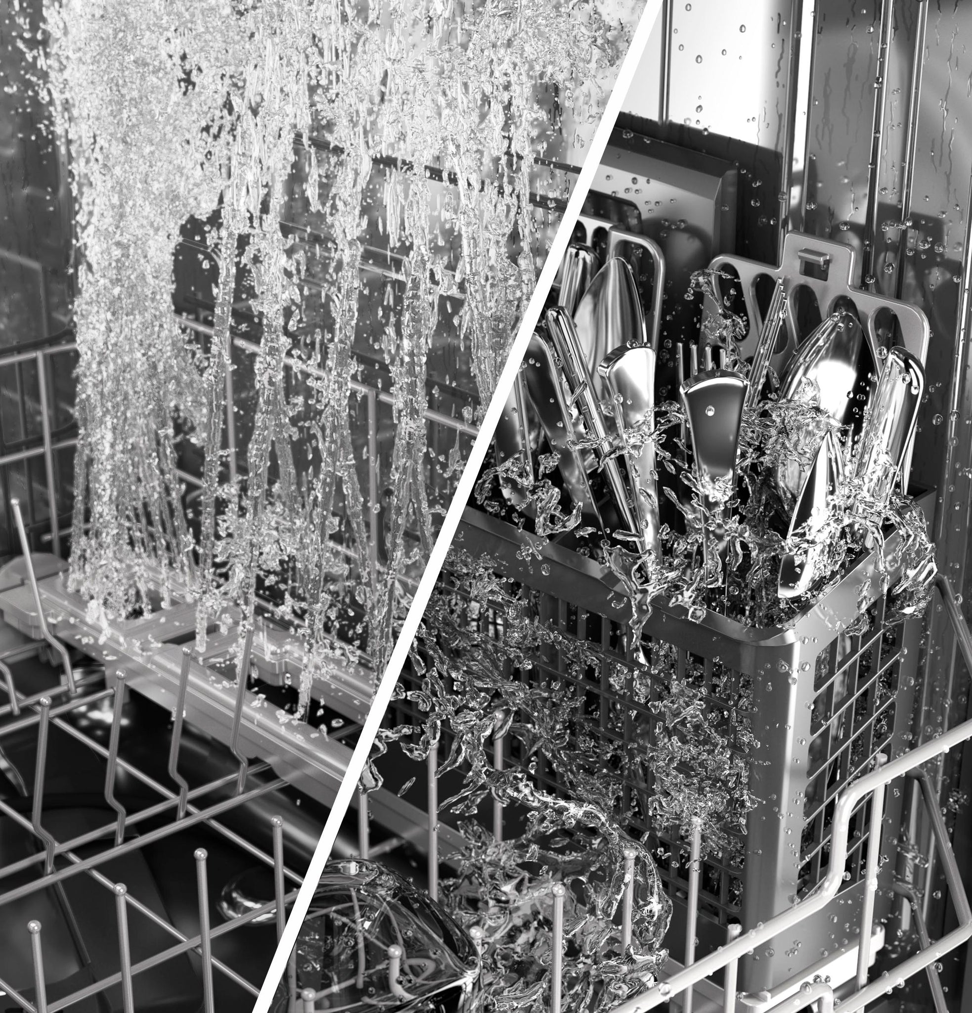 A system of 40 deep-cleaning silverware jets blasts the silverware basket from the bottom up, removing all stuck-on food for sparkling results.