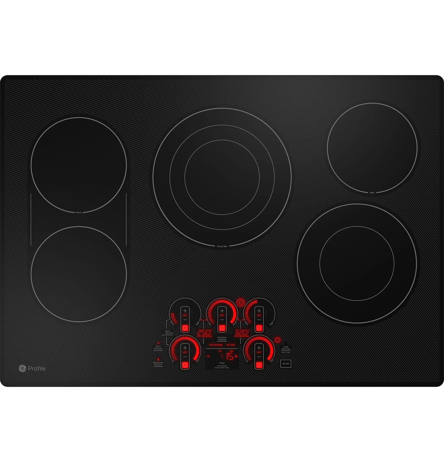 | Cooktop Control Features | All-Off Control Control Lock Capability Custom Settings Keep-Warm Setting Kitchen timer LED Light level adjustment Melt Setting Sound adjustment Sync-Burners Capability |