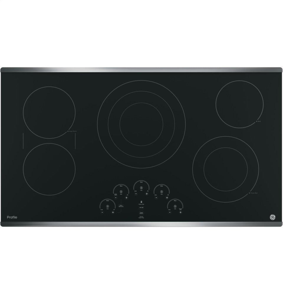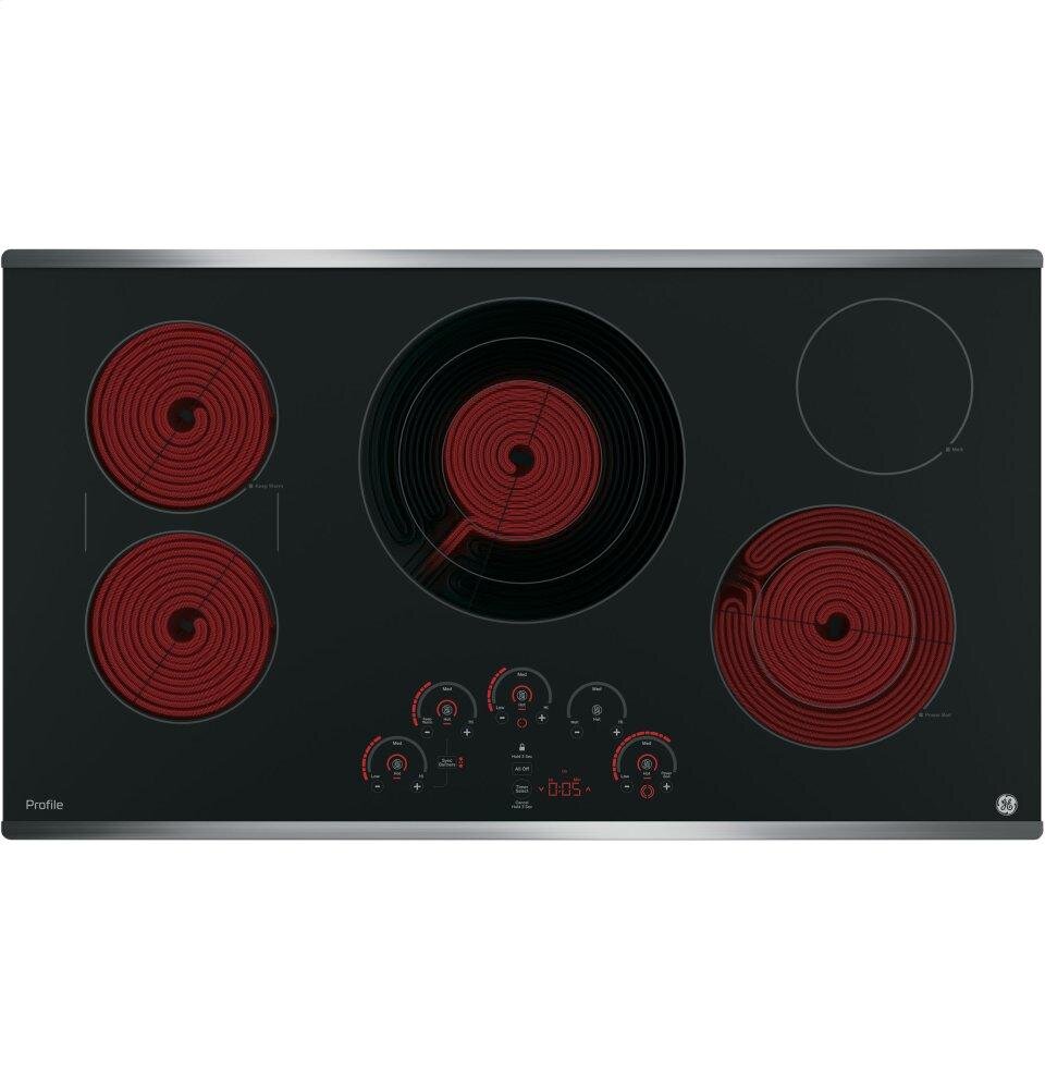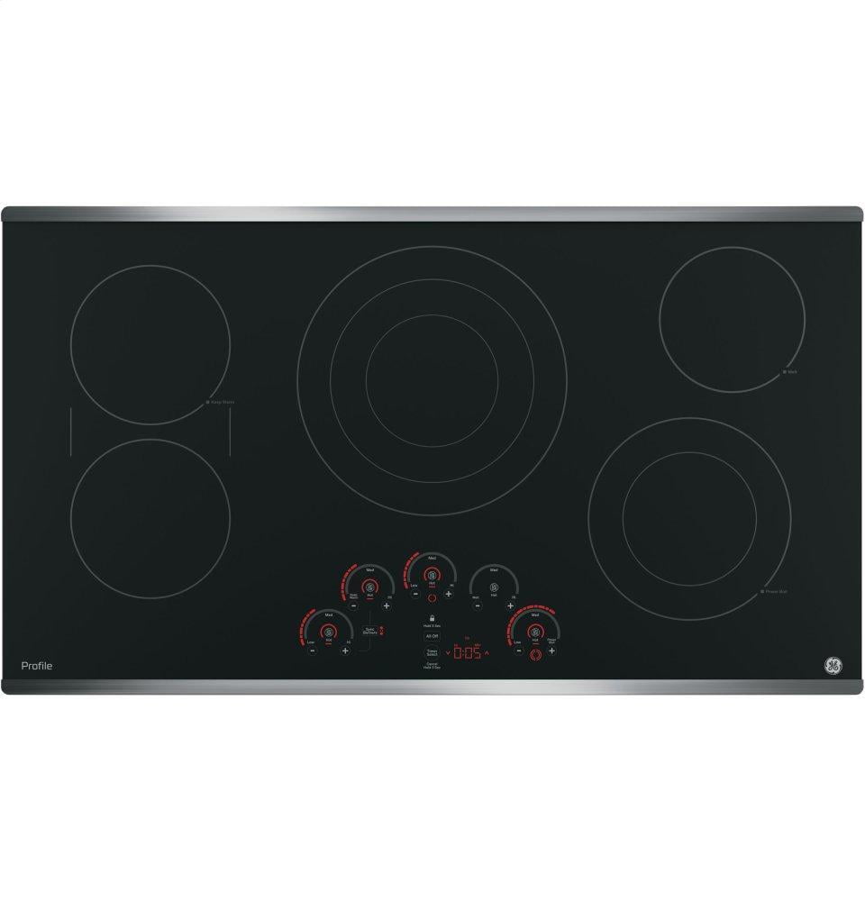 GE Profile™ Series 36" built-in cooktop. This cooktop features five radiant cooking elements, glide touch controls, and a multi-element timer offering custom settings to personalize your cooktop settings to fit your cooking style.
