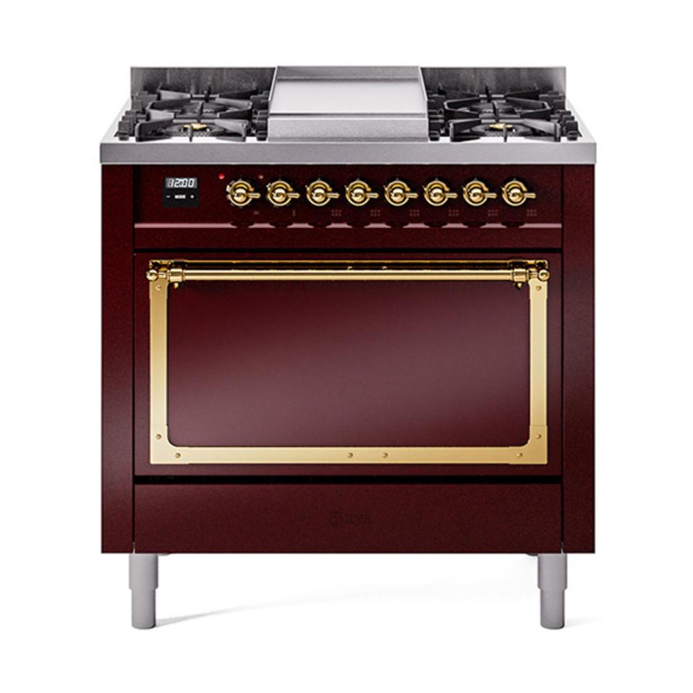 Ilve UN36FQNMPBUG Ilve Un36Fqnmpbug Nostalgie Ii Noblesse 36" Dual Fuel Range (Natural Gas, Solid Door, Burgundy, Brass)