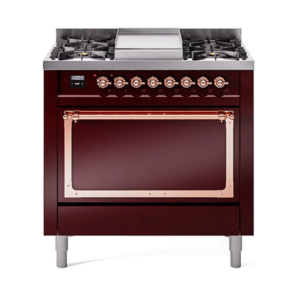 Ilve UN36FQNMPBUPLP Ilve Un36Fqnmpbuplp Nostalgie Ii Noblesse 36" Dual Fuel Range (Liquid Propane, Solid Door, Burgundy, Copper)