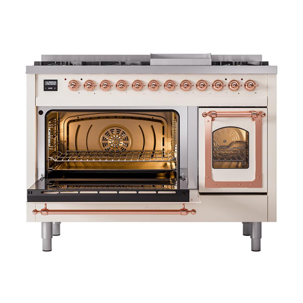 Ilve UN48FNMPAWPLP Ilve Un48Fnmpawplp Nostalgie Ii Noblesse 48" Dual Fuel Range (8 Sealed Burners + Griddle, Liquid Propane, Triple Glass Door, Antique White, Copper)