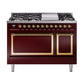 Ilve UN48FQNMPBUG Ilve Un48Fqnmpbug Nostalgie Ii Noblesse 48" Dual Fuel Range (8 Sealed Burners + Griddle, Natural Gas, Solid Door, Burgundy, Brass)
