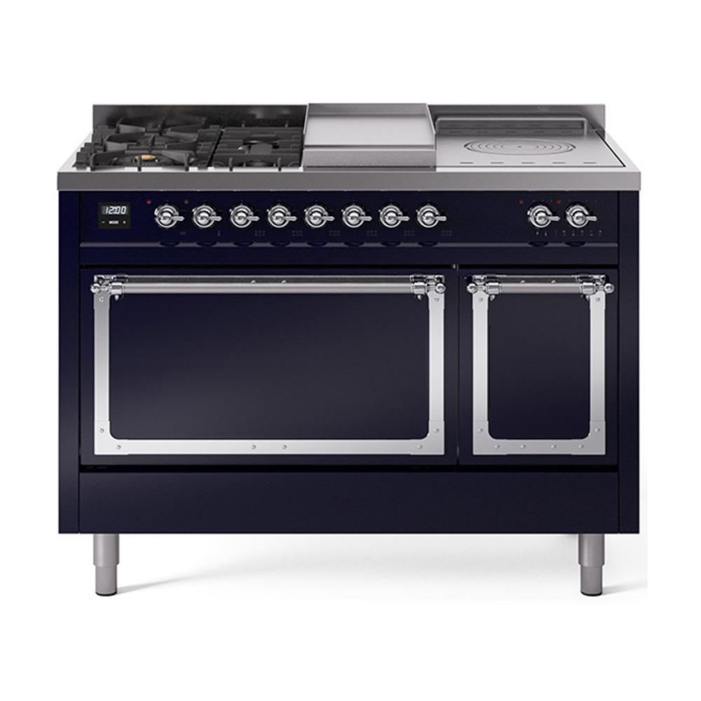 Ilve UN48FSQNMPMBC Ilve Un48Fsqnmpmbc Nostalgie Ii Noblesse 48" Dual Fuel Range (5 Sealed Burners + Griddle + French Top, Natural Gas, Solid Door, Midnight Blue, Chrome)