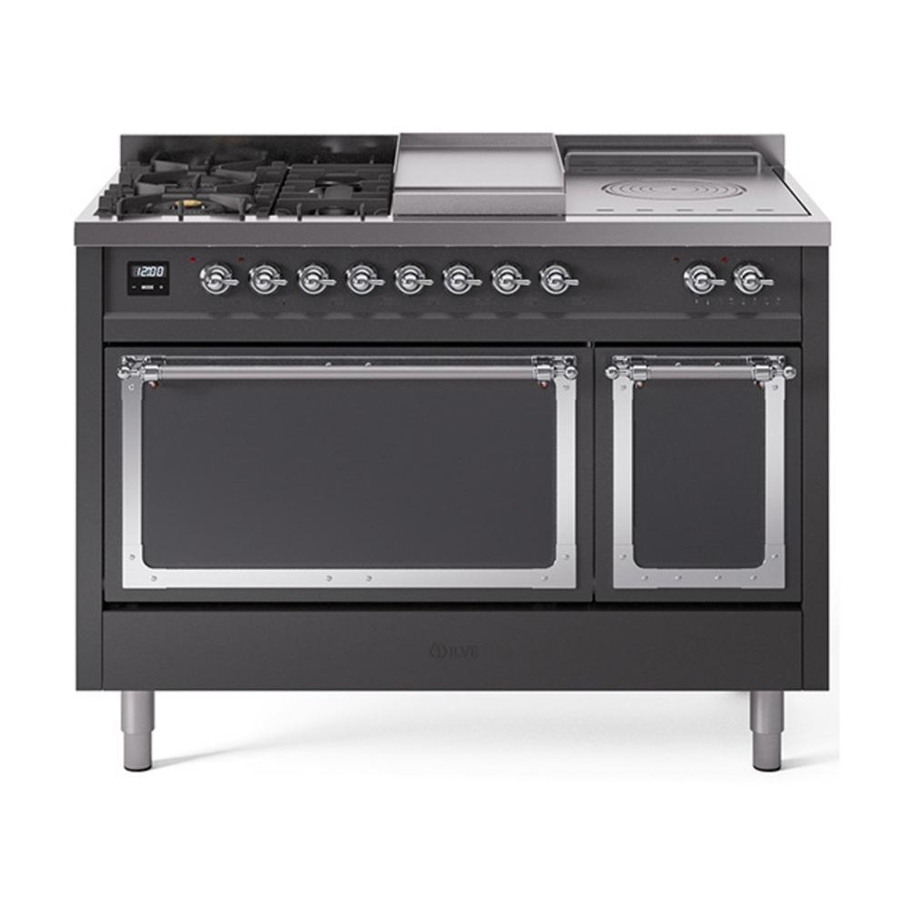 Ilve UN48FSQNMPMGC Ilve Un48Fsqnmpmgc Nostalgie Ii Noblesse 48" Dual Fuel Range (5 Sealed Burners + Griddle + French Top, Natural Gas, Solid Door, Graphite Matte, Chrome)