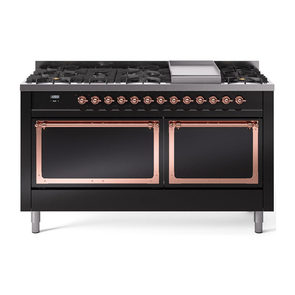 Ilve UN60FQNMPBKPLP Ilve Un60Fqnmpbkplp Nostalgie Ii Noblesse 60" Dual Fuel Range (9 Sealed Burners + Griddle, Liquid Propane, Solid Door, Glossy Black, Copper)