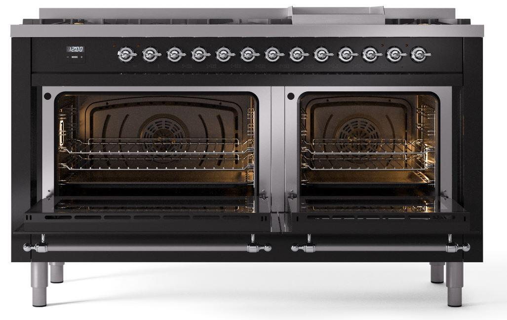 Ilve UP60FNMPBKCLP Nostalgie Ii 60 Inch Dual Fuel Liquid Propane Freestanding Range In Glossy Black With Chrome Trim