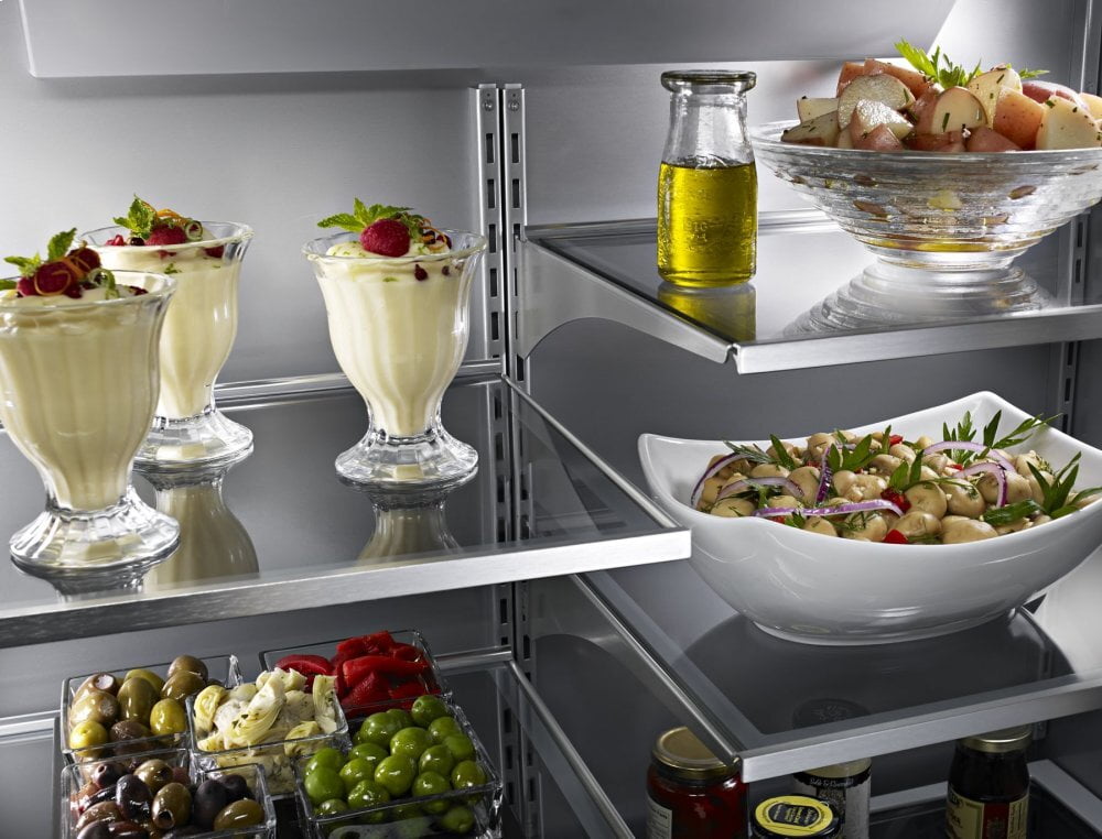 - Adjustable Spill-Resistant Glass Shelves - are easy to clean and help prevent messes from spilling over into other parts of the refrigerator. The shelf edges are nano-etched with a finely textured surface that helps contain spills, and lets you use the whole shelf from edge-to-edge.