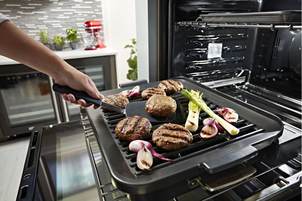 Allows true grilling year-round. It minimizes smoke and eliminates the flares common on outdoor grills, and its advanced design heats evenly from edge to edge. The grill fits interchangeably onto the base pan and heating element and connects to a powered hub in the oven, allowing you to control cooking manually or select modes that helpfully suggest when to turn chops or remove scallops. Easy-clean, dishwasher safe. The base pan, heating element and grill are shipped with the oven.
