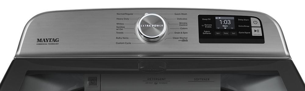 • Extra Power button Some stains dissolve best in hot water. Others in cold. With the push of a button, Maytag fights both in a single load. The Extra Power button boosts stain-fighting performance on any wash cycle with a dual-temperature wash.