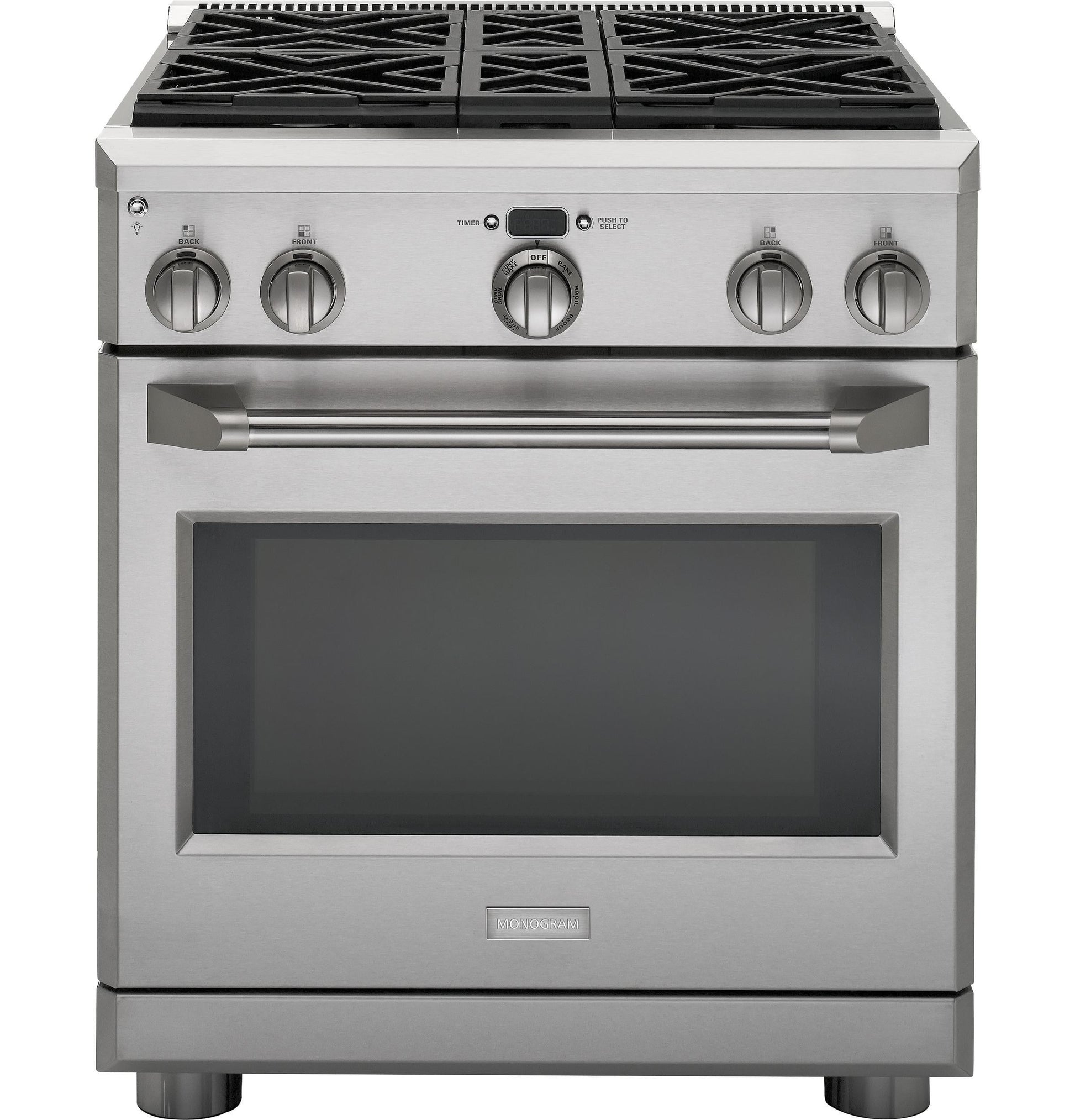 Authentic Professional AppearanceStainless Steel With Smoothly Finished Edges, Large Electronic Control Knobs And Heavy Duty Handles Sealed, Dual-Flame Stacked BurnersDeliver A Full Spectrum Of Heat Settings, From An Ultra-Low 140(Degree) F Simmer To An Intense 18,000 Btu Largest All-Gas Professional Oven Capacity Available In The 30" Professional Gas Range Category Monogram Professional Dual-Burner Bake SystemCombines Reverse-Air Convection Technology With An Infrared Broil And Gas Burner To Provide Superb Baking Results, With Fast Preheating Infrared Broil BurnerProduces Intense Heat Needed To Sear Meats To Lock In Juices And Is Thermostatically Controlled To Provide Top Browning When Baking Or Convection Baking Heavy-Duty Oven RacksGlide Smoothly In And Out On Stainless Steel Ball Bearings For Easy Access, And Are Designed To Remain In The Oven During The Self-Clean Cycle Led Task LightsBelow The Bullnose, Provide A Functional And Theatrical Touch Electronic Ignition With Automatic ReignitionEnsures A Continuous Flame And Reignites Automatically If Accidentally Extinguished Reversible Burner GratesFlat On One Side And Uniquely Contoured On The Other To Accommodate Round-Bottom Woks True Hidden BakeIs Achieved With A U-Shaped Burner Below The Oven Floor Providing Even Cooking Performance With A Clean Appearance Large Temperature And Time DisplaysMake It Easy To Monitor Cooking Progress Optional Full-Width Stainless Steel ToekickIs Included With The Range Star-K CertificationAllows Monogram Ranges To Operate In Sabbath Mode Halogen Light ColumnsProvide A Clear View, Regardless Of Rack Position