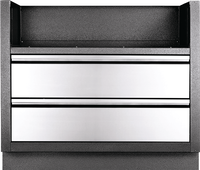 Oasis Under Grill Cabinet For Big38 Specially Made For The Built-In 700 Series 38" Gas Grill Heads, This Carbon Colored, Powder Coated, Galvanneal Cabinetry Features Increased Durability From The Two-Coat Pebbling Finishing System. Two Stainless Steel Drawers Are Mounted On Smooth Gliding Tracks For Under Grill Storage. Installation Is A Breeze With Knockouts For Gas And Electrical. Levelling Feet Ensure A Balanced Surface, Even If Your Patio Isn'T Perfectly Level. Partner This Cabinet With The Built-In 700 Series 38" Gas Grill Head And The Perfect Oasis Cabinets For A Custom Outdoor Grilling Oasis.