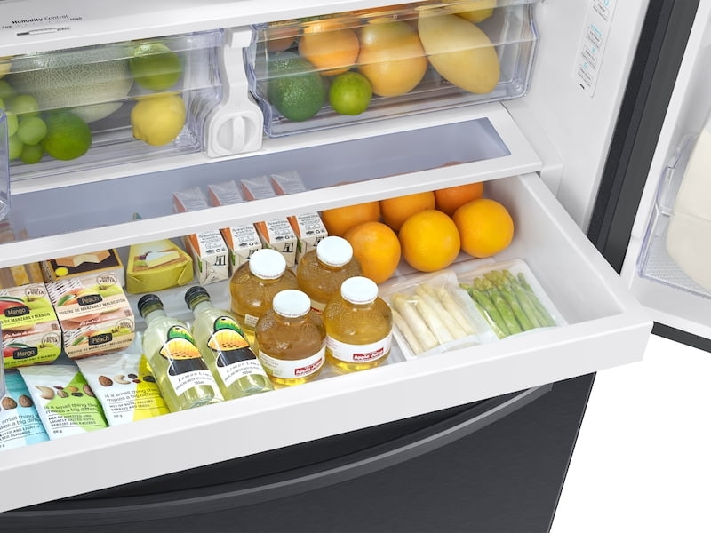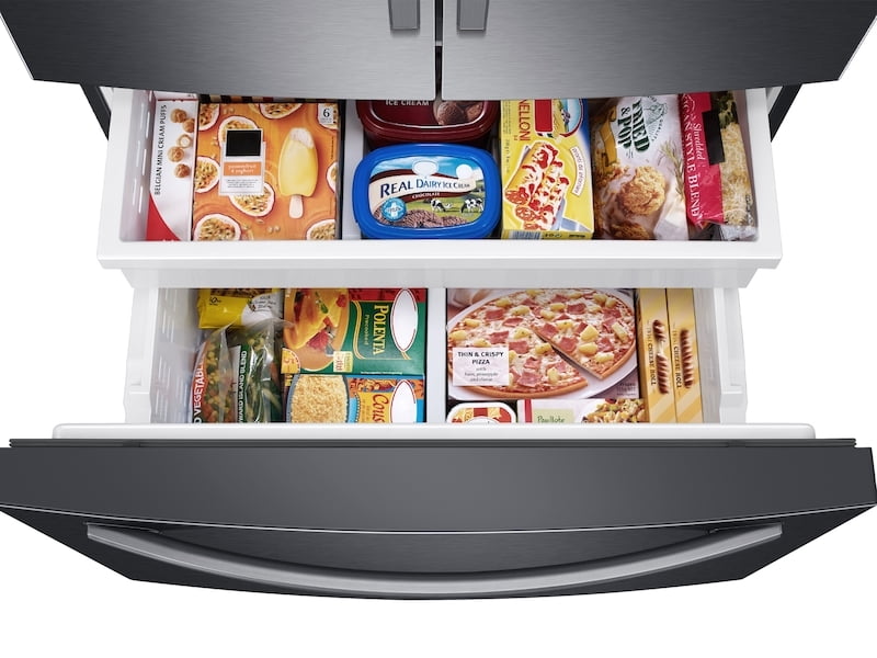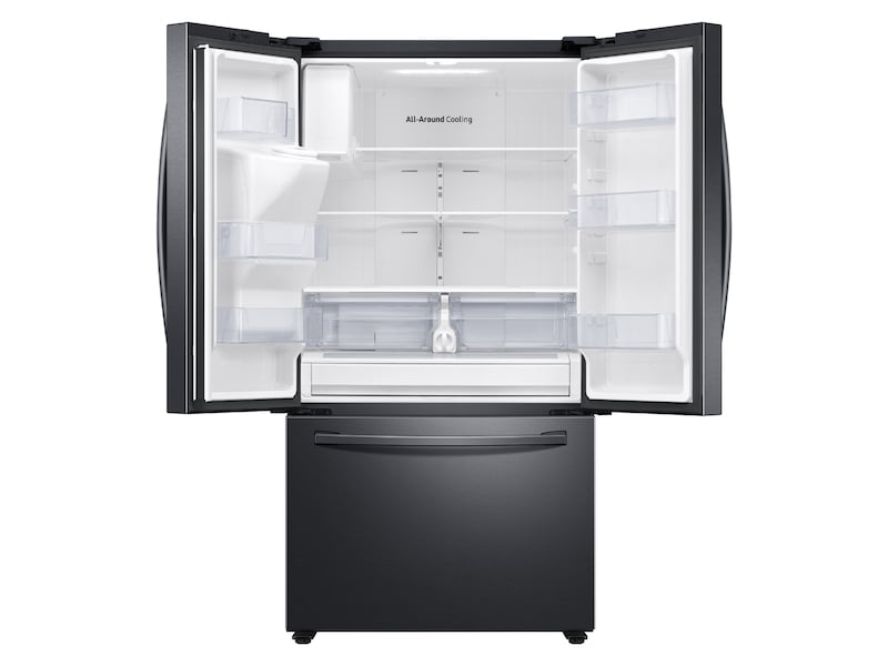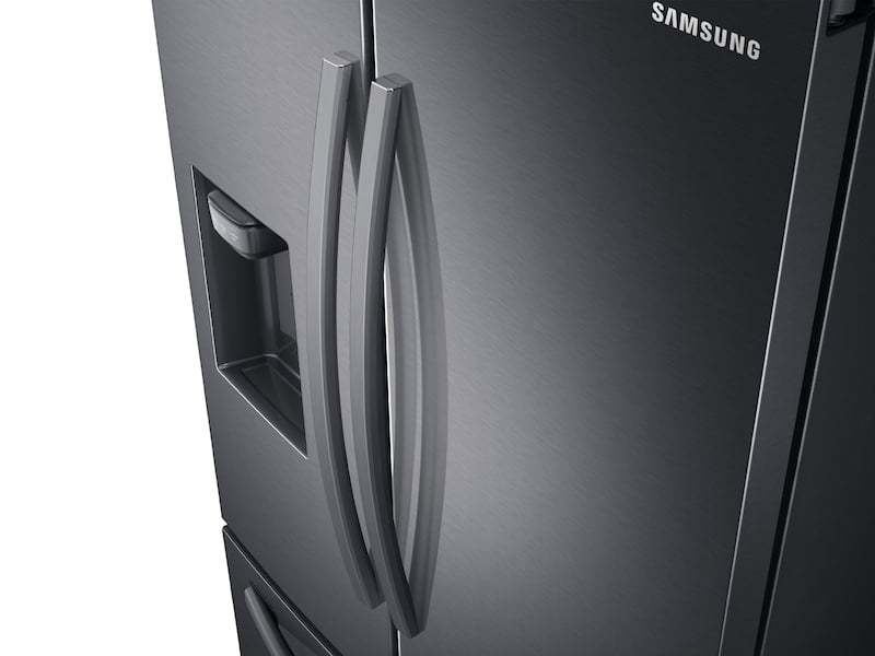 - Samsung's 27 cu. ft. large capacity 3-Door French Door refrigerator is beautifully designed, with a minimal dispenser, sleek-edge doors, and modern handles. The clean lines and distinct form blend beautifully into your kitchen while the fingerprint resistant finish withstands everyday smudges.