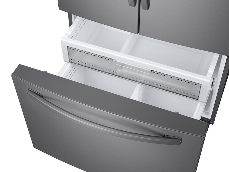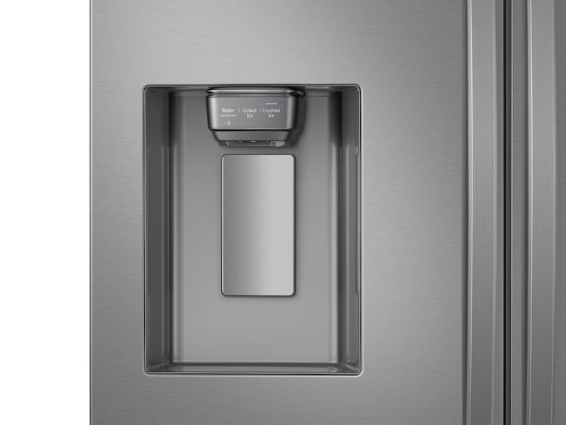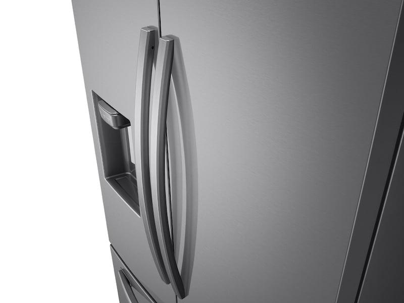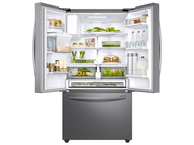 - Samsung's 3-Door French Door 28 cu. ft. refrigerator, is beautifully designed with a minimal display dispenser, sleek-edge doors, and an AutoFill Water Pitcher. A refrigerator with a modern design that blends beautifully into your kitchen and a finish that withstands everyday smudges.