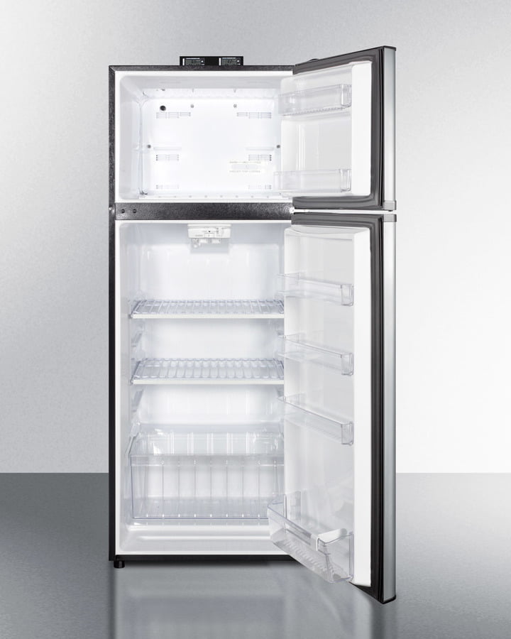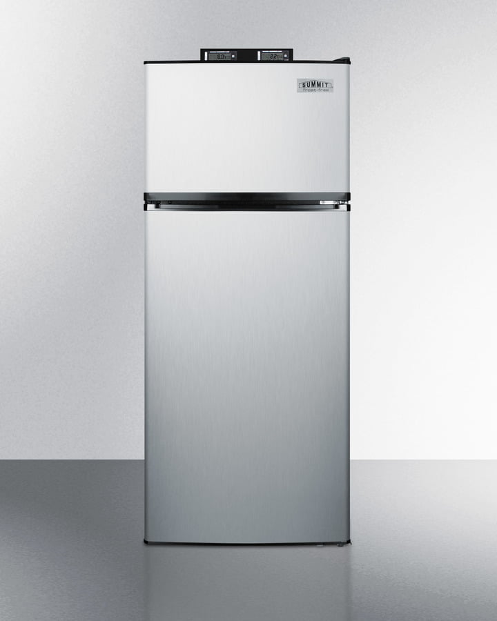 The Bkrf1159Ss Is A Mid-Sized Refrigerator-Freezer Specially Designed For Use In Break Rooms And Other Common Areas. Made In North America, This Two-Door Refrigerator-Freezer Offers Over 10 Cu.Ft. Of Storage Capacity Inside A Conveniently Slim 24" W X 26" D Footprint. The Temperature Is Managed By A Dial Thermostat, With Two Nist Calibrated Thermometers Externally Mounted On Top Of The Unit To Provide A Temperature Readout Of The Current And High/Low Temperatures In Each Section To The Nearest Tenth Of A Degree. Temperature Can Be Viewed In Celsius Or Fahrenheit For Added Convenience. Each Thermometer Includes An Audible High/Low Alarm Function To Warn Users If The Refrigerator Or Freezer Section Goes Out Of The User-Specified Temperature Range. Frost-Free Operation Ensures Low Maintenance, While The Interior Is Fully Equipped With Adjustable Shelves, A Large Crisper, Interior Light, And Door Storage In Both Compartments. This Unit Comes In A Textured Black Cabinet With User-Reversible Stainless Steel Doors. Additional Styles And Sizes Are Available. Note: Model Prefix "Bkrf" Is A Marketing Designation. Actual Unit Will Carry Summit Model Number Ff1159Ss.