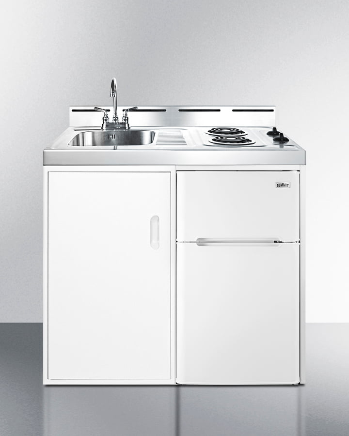 Complete All-In-One Convenience With A Refrigerator-Freezer, Cooktop, Sink, And Storage Compartment In Just 39" 2-Burner Coil Cooktop Includes Pre-Installed Cord Includes Our New Cm406W Refrigerator-Freezer Perfect In Small Quarters Or As A Temporary Kitchen Side Cabinet Offers Added Convenience For Dry Storage (Bull)24" Depth For An Easy Fit Summit Brings True Convenience To Smaller Spaces With All-In-One Combination Kitchenettes. Available In Four Sizes, These Units Come Fully Featured With Everything You Need For The Home Foodservice Experience, Including A 2-Burner Cooktop, Sink, Storage Cabinet, And Refrigerator With A Freezer Compartment. The C39El Is A 39" Wide Kitchenette With An Easy-Fitting 24" Depth. The 115V Radiant Cooktop Features A 900W And 500W Coil 6" 600W Coil Element For Easy Cooking, With Chrome Drip Pans To Ensure Simple Cleanup. The Stainless Steel Countertop Offers Durability With A Professional Look. This Unit Includes A Compact Sink With Ready-To-Use Faucet Included. A Cabinet With A Removable Shelf Is Located Below The Sink For Dry Storage. Unlike Our Competitors, Who Rarely Offer Freezers On Compact Kitchenettes, The C39El Includes The Cm406 Refrigerator With A Freezer Compartment. This Unit Includes Adjustable Glass Shelves And Door Storage. The C39El Is Packaged And Shipped In One Box. Perfect For Studio Apartments, Hotel Rooms, Dormitories, Assisted Living Facilities, Temporary Kitchen Facilities, And Any Other Location In Need Of A Low Maintenance, Fully Featured Compact Kitchenette. Additional Choices Are Available With Smooth-Top Cooktops, And In 30", 48", And 60" Wide Sizes. Browse Our Website For More.
