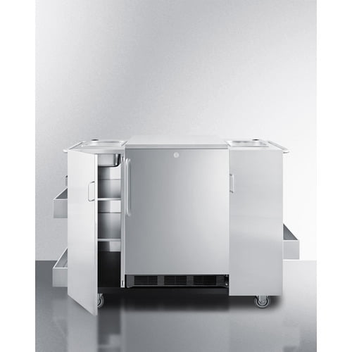 Weatherproof Design With Modern Style (Bull)Storage Shelves Inside And Out (Bull)Compete Stainless Steel Construction (Bull)Add A 24 Inch Wide Outdoor Refrigerator, Freezer, Or Beer Dispenser From Summit'S U.L. Outdoor Line Summit'S Cartos Brings Luxury And Convenience To The Outdoors In A Stainless Steel Serving Cart. This 61" Wide Unit Lets You Create An Upscale Kitchen Right In Your Own Backyard, Beginning With Ample Storage Space. Keep Items On Three Exterior Shelves And Inside Magnetic Locking Doors Fitted With Elegant Towel Bar Handles. The Cart Includes Room For Ice Storage And A Removable Stainless Steel Countertop. Cart Os Is Completely Constructed From 304 Grade Stainless Steel To Weather The Elements In Classic Style. You Can Remove The Center To Install A Summit Refrigerator, Freezer, Or Beer Cooler For More Storage Options.