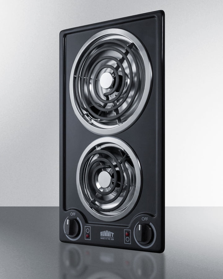 Slim 12" Width Is An Ideal Fit For Hotels, Tiny Homes, And Other Kitchens With Limited Counter Space. 115V Design With Pre-Installed Power Cord. Recessed Surface In A Black Porcelain Finish Brings Cleaner Style To The Kitchen. Coil Elements For Long-Lasting Durability. Made In The USA Summit Offers An Extensive Selection Of Slim-Fitting Cooktops Designed And Manufactured In The USA. The Cce212Bl Is A 115V Cooktop With A Porcelain Surface In A Jet Black Finish. Two Coil Elements (6" 600W In Front And 8" 900W In Rear Offer Durable Heating, With Removable Chrome Drip Pans Included. The Push-To-Turn Knobs Are Simple And Intuitive, With Indicator Lights That Show Which Burner Is In Use For Added Safety. The Recessed Design Helps To Contain Spills For A Cleaner Cooking Experience. This Cooktop Includes A 3-Pronged 4' Long Power Cord For Convenient Installation. It Is Designed To Fit Common 11 1/8" W X 19 1/8" D Counter Cutouts. Additional Choices Are Available In White And Stainless Steel, As Well As Radiant, Induction, And Gas Cooktops In Similar Sizes. Browse Our Website For Our Complete Selection Of Slim-Fitting Cooking Appliances.