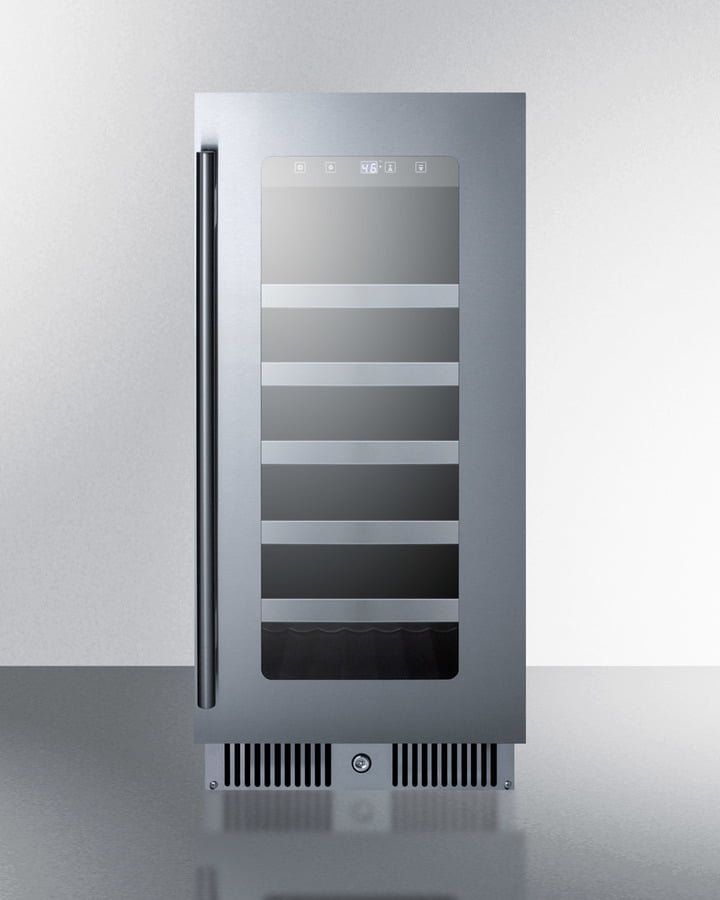 Flexible Design Allows Built-In Or Freestanding Use Seamless Stainless Steel Trim On Glass Door Brings Elevated Style Under The Counter 15" Width Is Perfect For Home Bars Deluxe Interior With Stainless Steel Trimmed Black Shelves And White Led Lighting Digital Thermostat Offers Precise And Convenient Temperature Control The Summit Classic Collection Features Deluxe Undercounter Wine Cellars Designed To Bring Modern Luxury Into The Home. At Just 15" Wide, The Cl155Wc Is The Perfect Wine Cellar To Complement A Home Wet Bar. The Front-Breathing Design Allows Built-In Installation Under Counters, While The Fully Finished Cabinet In A Jet Black Finish Also Enables Freestanding Use. This Unit Features A Glass Door With Seamless Stainless Steel Trim, With A Stainless Steel Handle And Designer Kickplate Completing The Stunning Look. A Front Lock Offers Convenient Security. This Unit Has A Right-Hand Door Swing. For A Left Hand Version, See The Cl155Wclhd. This Unit Can Be Paired With The Matching Cl156Bv/Lhd Beverage Center To Create A Side-By-Side Set. Inside, White Led Lighting Helps To Attractively Illuminate The Black Interior For An Easy View Of Your Collection. Five Wooden Shelves Feature A Black Finish And Stainless Steel Front Trim To Store Up To 29 Standard 750Ml Bordeaux Bottles. For Wider Burgundy Style Bottles, Store 4 On The Upper Shelf, Or Remove Some Of The Middle Shelves To Provide More Spacing To Accommodate The Larger Size. The Interior Control Panel Includes A Digital Thermostat For Easy And Intuitive Operation, With A Readout Viewable In Celsius Or Fahrenheit. An Internal Fan Ensures The Interior Is Evenly Cooled From Top To Bottom, While The Auto Defrost Operation Ensures Minimal User Maintenance. Additional Features Include A Temperature Memory Function To Restore Set Temperature In The Case Of Power Loss And Sabbath Mode Which Disables Certain Functions During Periods Of Religious Observance. A Built-In Alarm Audibly Warns If The Door Is Left Ajar Or If The Unit Rises Or Falls Out Of The Recommended Temperature Range. Two Level Legs Helps To Balance The Unit On Uneven Surfaces. Uniquely Styled And Fully Featured, The Cl155Wc Brings True Luxury To Small Kitchen Spaces. For This Unit With A Dual-Zone Design, See The Cl244Wc. Note: This Unit Comes With An Anti-Tip Bracket That Should Be Installed To Help Prevent Tipping Of The Unit For Added Safety.