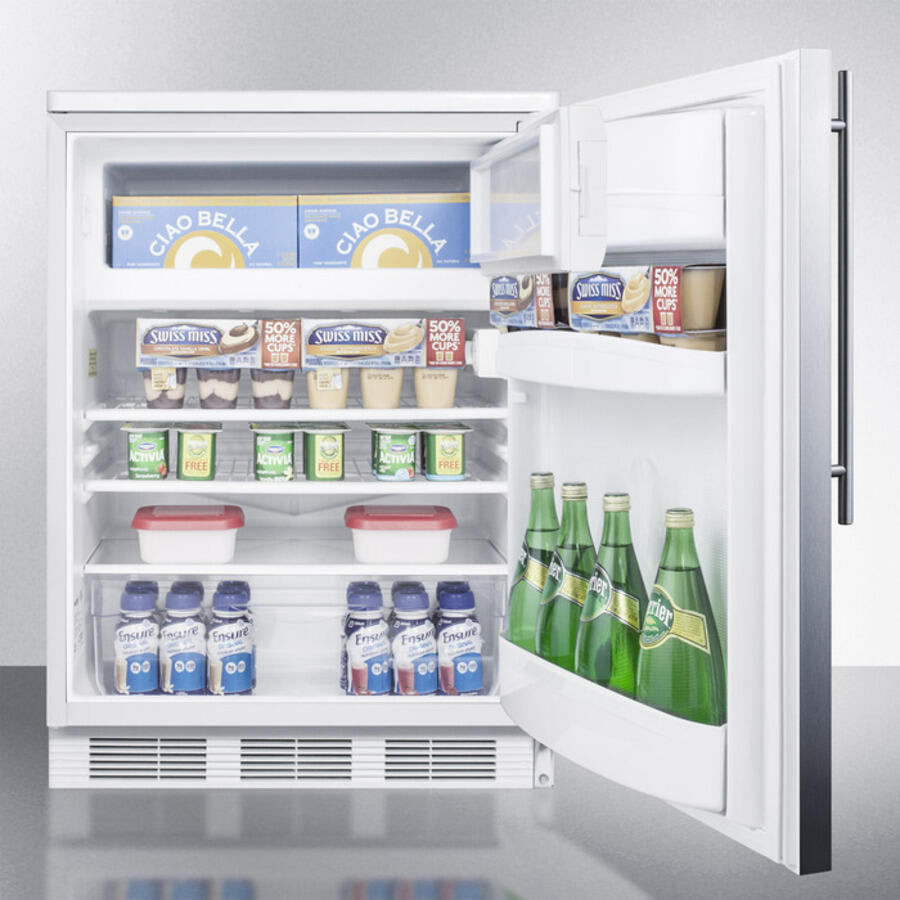 Stainless Steel Door Complete With Sleek Handle Adds Modern Elegance To Any Setting Factory Installed Lock Provides Security You Can Count On Flexible Design Allows Built-In Or Freestanding Use In 24" Spaces Improved Temperature Performance With Our Unique Dual Evaporator Cooling Includes Door Storage And Adjustable Shelves Over 5 Cu.Ft. Of Storage Capacity In A Perfectly Sized 24" Footprint Made In Europe Accucold By Summit Appliance Offers A Wide Range Of Undercounter Refrigeration For General Purpose Storage. The Ct66Jbi Series Includes Built-In Undercounter Refrigerator-Freezers Equipped With Dual Evaporator Cooling For Optimum Storage Conditions. Sized With A 24" Footprint, The Ct66Lbisshv Can Be Used Built-In Under Counters Or Freestanding. The Interior Offers Over 5 Cu.Ft. Of Storage Capacity. This Model Has A White Cabinet And Reversible Stainless Steel Wrapped Door With A Factory Installed Front Lock. A Thin Handle With A 14Mm Diameter Completes The Sleek, Modern Look. Inside, Our Unique Dual Evaporator System Separately Cools The Refrigerator And Freezer Section To Ensure Proper Storage Temperature. Cycle Defrost Operation Reduces User Maintenance In The Automatic Defrost Fresh Food Section, With Static Manual Defrost Operation In The Freezer Compartment. Door Storage Provides Easy Access For Tall Bottles And Small Condiments. Additional Features Include Adjustable Shelves, A Clear Crisper, And Automatic Interior Lighting. The Ct66Lbisshv Has Long Proven Itself To Have One Of The Best Temperature Performance Records In The Industry. To See Additional Finish Options On This Unit, Browse The Full Ct66Jbi Series. Note: This Unit Is Designed For General Purpose Applications And Does Not Meet Doe Energy Standards For Residential Use.
