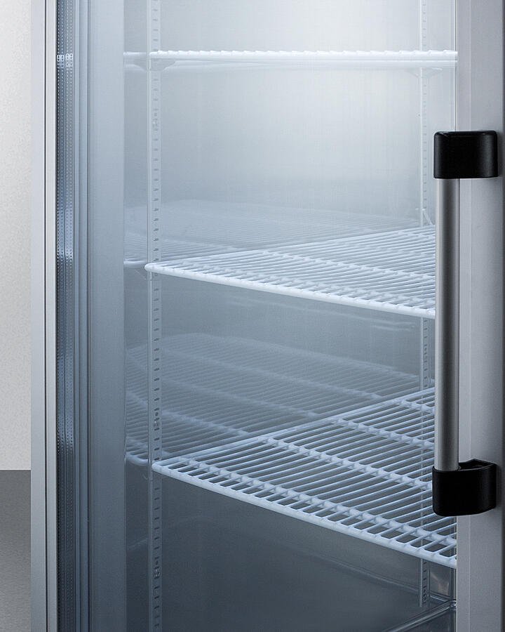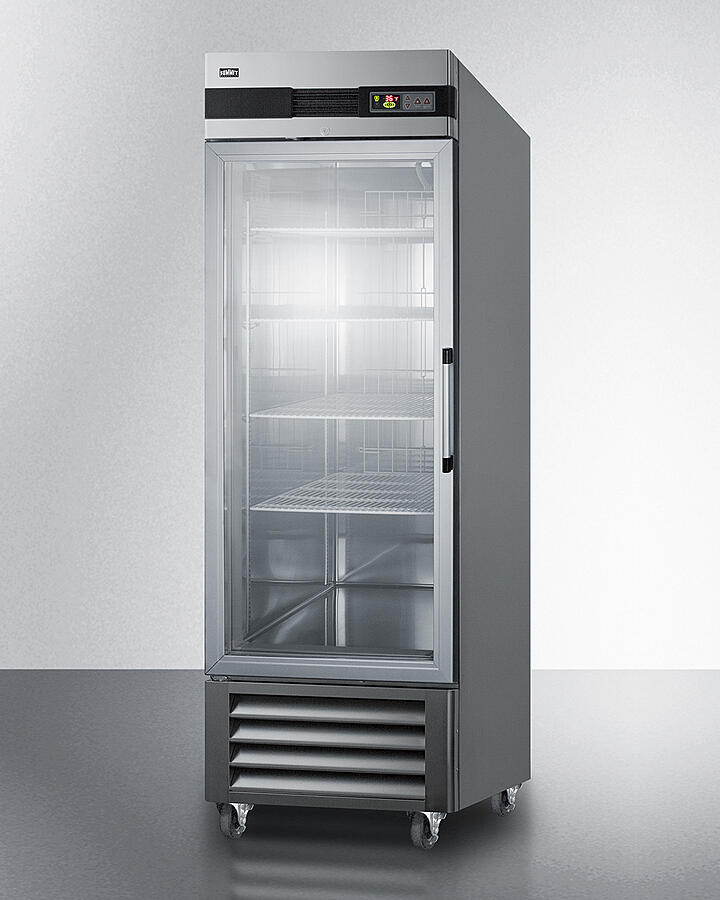 Summit Commercial's Line Of Reach-In Refrigeration Features Durable Construction Built To Nsf-7 Commercial Standards. Made In South Korea, The Scr23Ssglh Is A Commercial All-Refrigerator With A Complete Stainless Steel Cabinet And Double Pane Tempered Glass Door For A Full Product Display. The Door Is Self-Closing Design To Help Protect Stored Contents In Busy Commercial Settings Where Customers May Not Take The Time To Make Sure The Door Is Closed. It Will Remain Open When Pushed To 90 , Making It Easier To Load And Unload The Unit. The Sealed Back Design Helps To Simplify Cleanup. This Unit Features A Factory-Installed Lock Located Towards The Top Of The Door For Convenient Security. We Include A Set Of Locking Casters For Optional Installation. The Door Has A Left Hand Swing. For The Same Unit With The Door Opening From The Other Side, See The Scr23Ssg. The Scr23Ssglh Features A Large 23 Cu.Ft. Interior Constructed From Stainless Steel For Easy Cleanup And Lasting Durability. The Cantilevered Shelving System Allows You To Adjust The Four Vinyl-Coated Shelves To Virtually Any Position, Making It Easy To Accommodate Any Sized Item. This Unit Is Designed To Fit Common Commercial Baking Trays. The Led Lighting Offers An Energy Efficient Display When The Door Is Opened. It Utilizes Adjustable Cycle Defrost Operation To Avoid Temperature Spikes, With A Top-Mounted Forced Air Cooling System To Ensure Rapid Temperature Recovery. To Ensure Optimum Storage Conditions, The Scr23Ssglh Is Equipped With A Microprocessor Temperature Controller That Makes It Easy For Staff To Adjust The Temperature. The Large Digital Led Readout Displays The Current And High/Low Temperatures In Celsius Or Fahrenheit. An Audible And Visual Temperature Alarm Sounds If The Unit Rises Or Falls Above A User-Set Rage. Additional Alarms Include A Power Failure Alert, Door Open Alarm, And A Condenser Cleaning Reminder. Designed With Hydrocarbon Refrigerant, The Scr23Ssglh Provides An Energy Efficient Solution To Large Capacity Storage. It Is Etl-S Listed To Nsf-7 Commercial Standards. For A Matching Solid Door Frost-Free Freezer, See The Scff237.