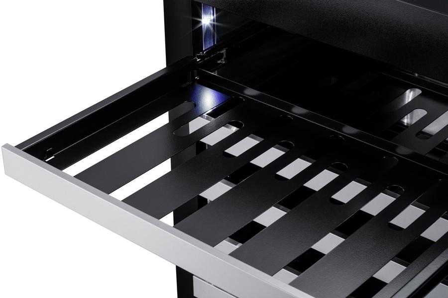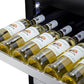 - 33-bottle capacity with five gliding shelves that can each hold up to 6 bottles, and a floor shelf to hold up to 3 bottles in a horizontal configuration (NOTE: capacity may vary depending on specific bottle style)