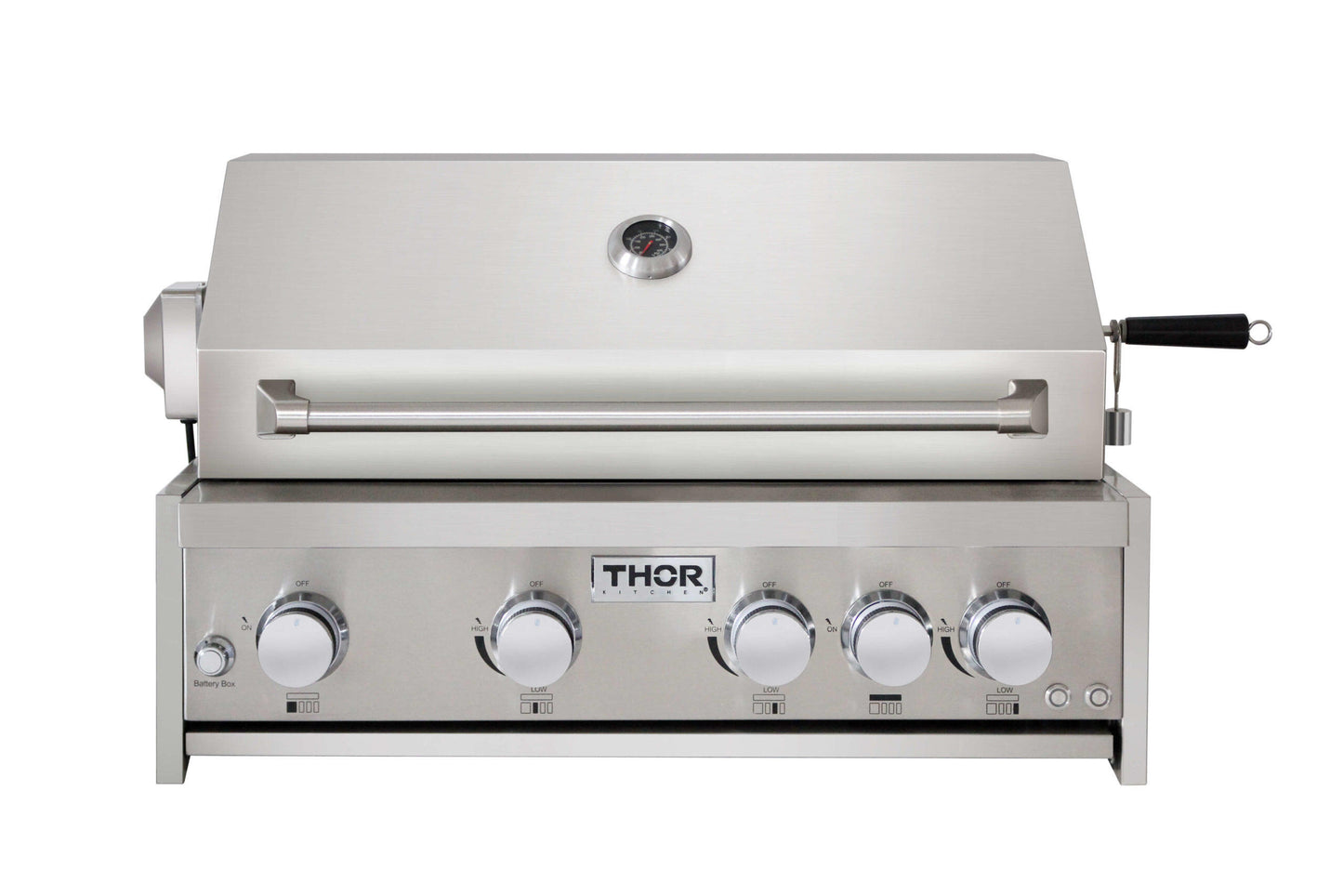 Thor Kitchen Offers The Power And Performance Of A Premium Pro-Style Appliance At A Practical Price. The Thor Kitchen 32 Inch 4-Burner Built-In Gas Grill Is Designed To Be Built-In To A Cabinet, Or Sit On Top Of And Connect To Our 32 Inch Grill Cabinet (Not Included). This Powerful Grill Has One 13,000 Btu Infrared Burner And Three 12,000 Btu Tube Burners, Giving You Full Control To Create Hot And Cool Areas On Your Que. It Also Features A 10,000 Btu Rear Infrared Rotisserie Burner, Because Rotating A Bird Keeps It Juicy. The Brilliant Blue Led Knob Lights Add A Bold, Stylish Touch To Your Outdoor Set Up. #Cooklikeagod (Ul)(Li)Dimensions (Wxhxd): 32.0625" X 10.5" (Grill Cover) X 26"(/Li)(Li)Fuel Type: Liquid Propane / Natural Gas Conversion Available(/Li)(/Ul) Raw Power (Performance) Four Burners With One 13,000 Btu Infrared Burner And Three 12,000 Btu Tube Burners, You Have Full Control To Create Hot And Cool Areas On Your Que Infrared Rotisserie Burner A 10,000 Btu Rear Infrared Rotisserie Burner Allows You To Rotate Meats Are Sear In The Juices Liquid Propane Or Natural Gas Option Ready To Use With Liquid Propane, Or Convert To Natural Gas With Accessory Kit (Sold Separately) Stylish Good Looks (Design) Built-In Grill Designed To Be Built-In, Or Sit On Top Of The Thor 32-Inch Grill Cabinet (Sold Separately) Led Knob Lights The Brilliant Blue Led Knob Lights Add A Bold, Stylish Touch To Your Outdoor Set Up Stainless Steel Exterior 304 Stainless Steel Resists Rust, Ensures Longevity And Is Easy To Clean