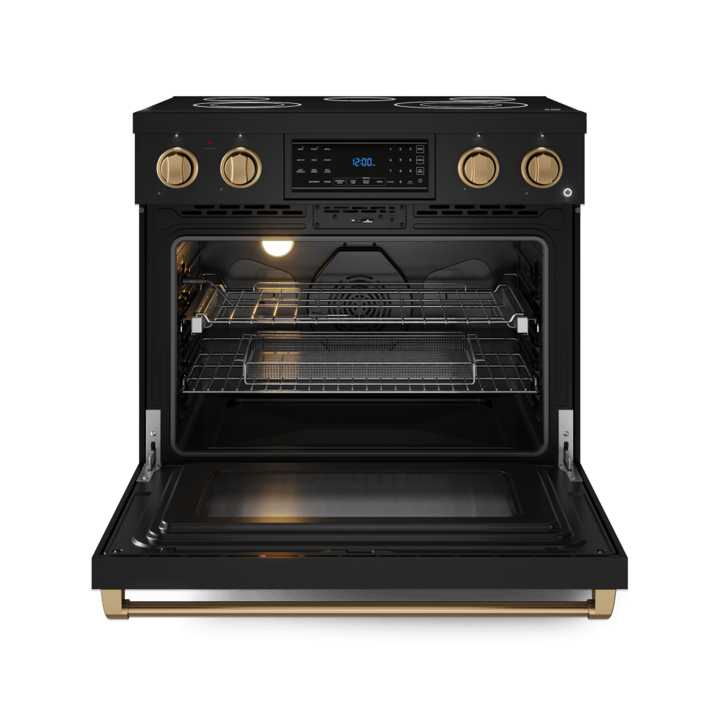 [Pre-Order] 36 Inch Professional Electric Range With Tilt Panel Touch Control In Black/Bronze Gordon Ramsay Series - Rse36B-Brz Designed For Chefs Who Demand Precision And Power. With High-Output Burners, Even Heat Distribution, And Intuitive Controls, This 36 Inch Professional Electric Range In Black/Bronze Elevates Your Cooking Experience. Built For Durability And Performance, It Brings Restaurant-Grade Quality To Your Home Kitchen, Making Every Meal Exceptional.