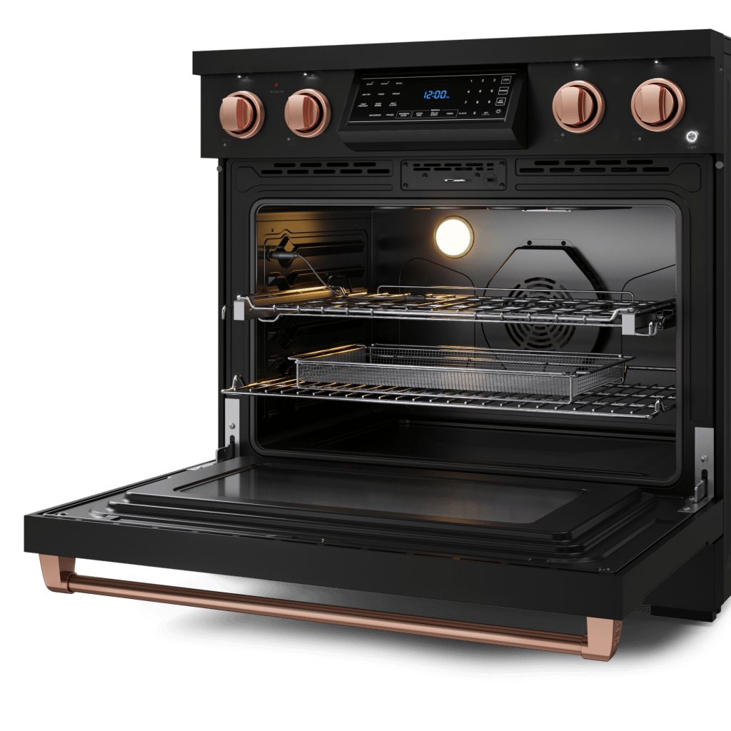 [Pre-Order] 36 Inch Professional Electric Range With Tilt Panel Touch Control In Black/Rose Gold Gordon Ramsay Series - Rse36B-Rsg Designed For Chefs Who Demand Precision And Power. With High-Output Burners, Even Heat Distribution, And Intuitive Controls, This 36 Inch Professional Electric Range In Black/Rose Gold Elevates Your Cooking Experience. Built For Durability And Performance, It Brings Restaurant-Grade Quality To Your Home Kitchen, Making Every Meal Exceptional.