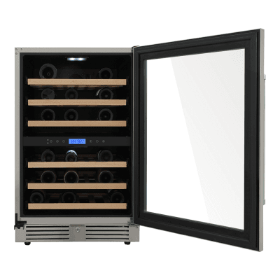 Introducing The Thor Kitchen Twc2401Do - A Dual Zone Wine Cooler 24 Inch Storage Cabinet Featuring Touch Control Lcd Display With 21-Bottle / 95 Can Storage Capacity.