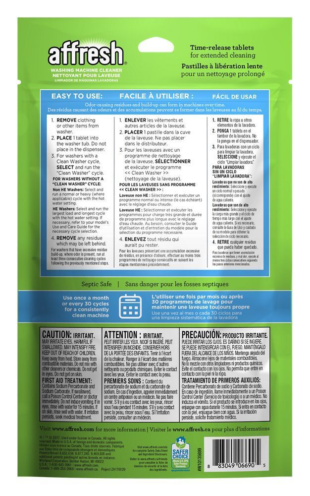 Affresh® Washing Machine Cleaner Deep Cleans To Help Remove The Odor-Causing Residues And Grime That Daily Loads Leave Behind. The Time-Release Tablets Are Epa Safer Choice Certified, Septic-Safe And Designed To Clean Inside All Machines, Including He (High Efficiency). Use Monthly Or Every 30 Cycles For A Consistently Clean Machine.