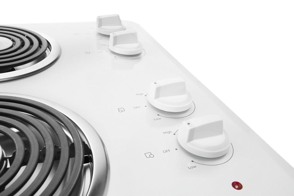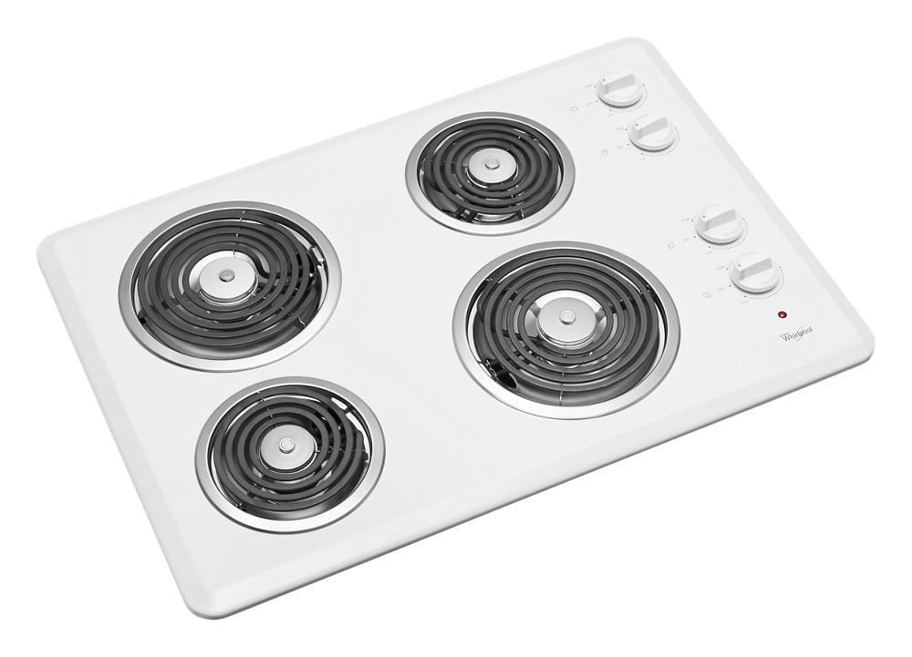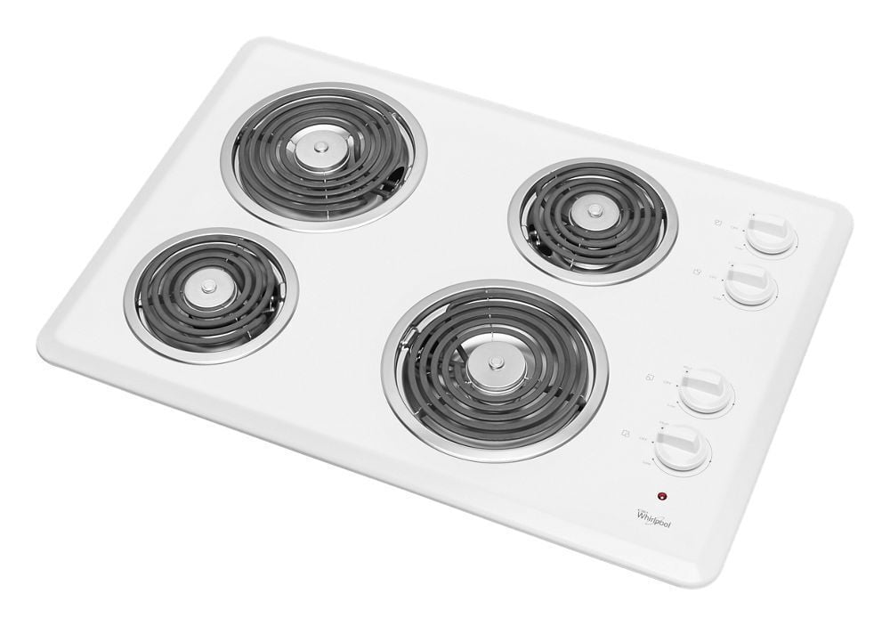 The Whirlpool 30” Electric Cooktop features a porcelain surface with matching porcelain knobs to give your kitchen an elegant, clean look. The main features of this cooktop, however, are the four coil elements. Two large 8-inch burners and two standard 6-inch burners give you the opportunity to cook using different sizes of pots and pans and prepare different parts of a dish simultaneously. The high-speed coil elements also provide consistent cooking performance by heating your items quickly and evenly.