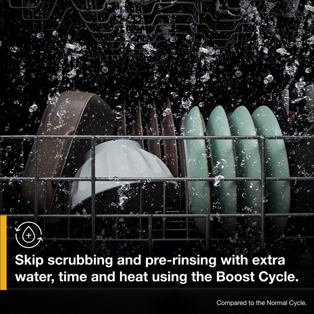 Skip scrubbing and pre-rinsing with the Boost Cycle. This cycle uses more water, time and heat than the Normal Cycle and takes less time than the Heavy Cycle so you can target tough messes that need a little extra effort.